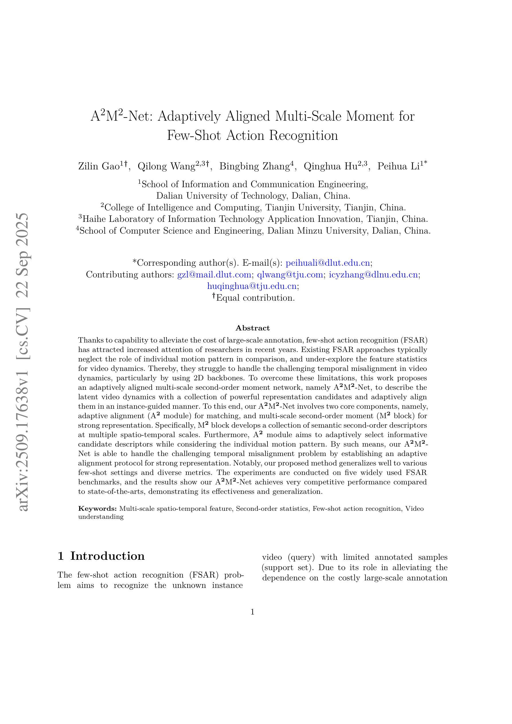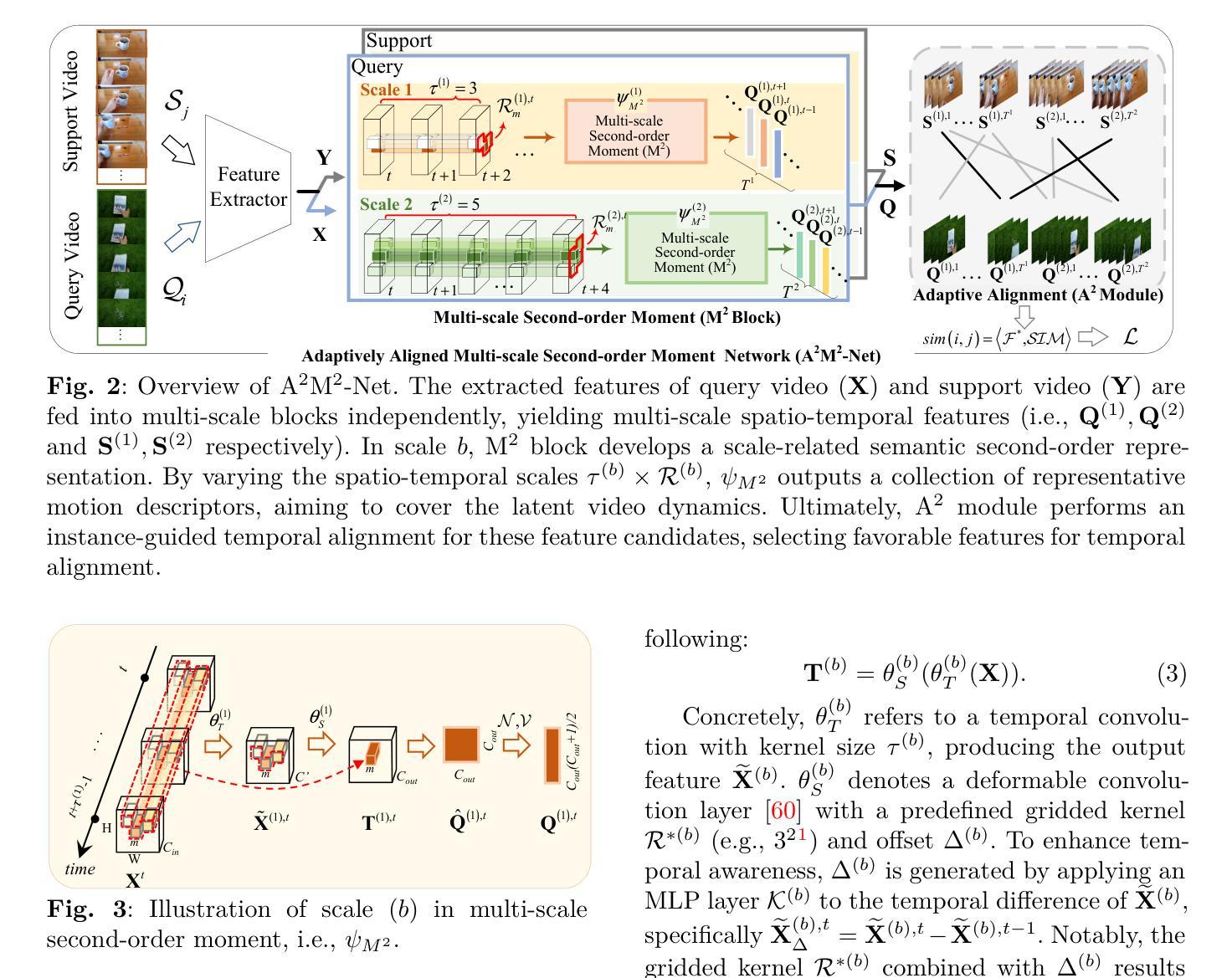 本文提出一种名为A$^2$M$^2$-Net的适应对齐多尺度二阶矩网络,用于描述潜在的视频动态,并通过实例引导的方式自适应对齐。该网络包含两个核心组件:用于匹配的适应性对齐(A$^2$模块)和用于强表征的多尺度二阶矩(M$^2$块)。M$^2$块在多个时空尺度上生成语义二阶描述符,而A$^2$模块则旨在自适应选择信息候选描述符,同时考虑个体运动模式。因此,A$^2$M$^2$-Net能够处理具有挑战性的时间错位问题,为强表征建立自适应对齐协议。在五个广泛使用的FSAR基准测试上的实验结果表明,A$^2$M$^2$-Net与现有技术相比取得了极具竞争力的性能。