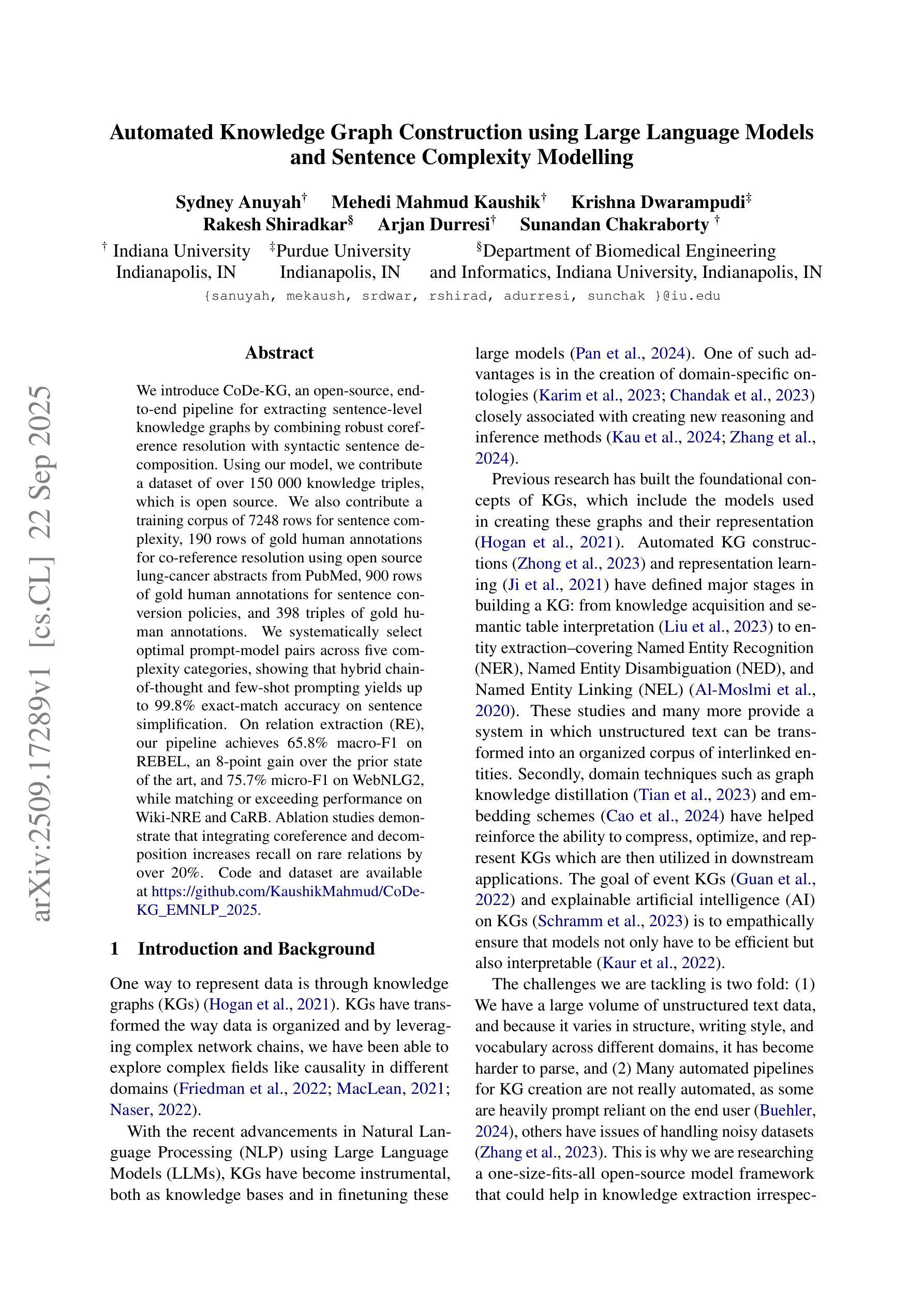 我们介绍了CoDe-KG这一开源的端到端知识图谱提取管道,它结合了鲁棒的核心引用解析和句法句子分解来提取句子级知识图谱。使用我们的模型,我们贡献了一个包含超过15万条知识三元组的开源数据集。我们还为句子复杂度贡献了7248行的训练语料库,使用PubMed的开源肺癌摘要为核心引用解析贡献了190行的黄金人类标注,为句子转换策略贡献了900行的黄金人类标注,以及398个知识三元组的黄金人类标注。我们系统地选择了五个复杂度类别中的最佳提示模型对,表明混合思维链和少量提示在句子简化方面可以达到高达99.8%的精确匹配准确率。在关系抽取(RE)方面,我们的管道在REBEL上实现了65.8%的宏观F1分数,比现有技术高出8个百分点,在WebNLG2上实现了75.7%的微观F1分数,同时在Wiki-NRE和CaRB上的性能相匹配或更高。消融研究表明,集成核心引用和分解可以将稀有关系的召回率提高超过20%。代码和数据集可在https://github.com/KaushikMahmud/CoDe-KG_EMNLP_2025找到。