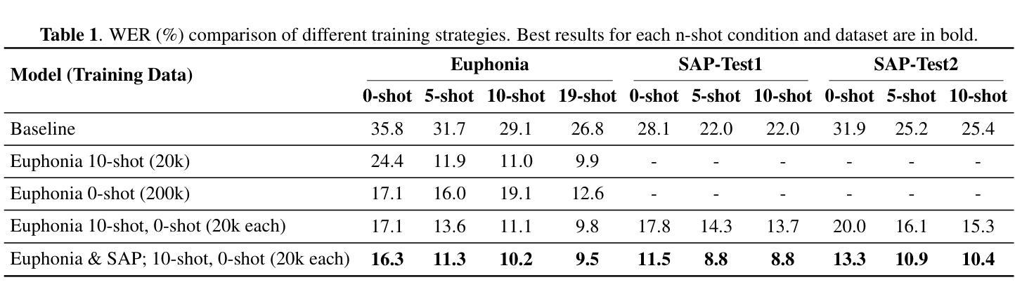 个性化自动语音识别(ASR)对于发音障碍者的语音至关重要,但由于需要训练并存储个别用户适配器,这具有挑战性。我们提出了一种混合元训练方法,该方法适用于单一模型,通过上下文学习(ICL)实现零样本和少量样本即时个性化,表现出卓越性能。在最新子集上测量词错误率(WER),该模型在Euphonia上实现了13.9%的WER,超过了非说话人依赖的基线(17.5%的WER),并与用户特定的个性化模型相匹敌。在SAP测试1中,其5.3%的WER明显优于个性化适配器的8%。我们还证明了示例选择的重要性,其中理想文本相似性方法表明,通过精心挑选的5个示例可以实现与随机选择的19个示例相似的性能,这突显了未来提高效率的关键领域。最后,我们通过数据消融法测量了这种方法的数据效率。这项工作提供了一个实用、可扩展和个性化的解决方案。