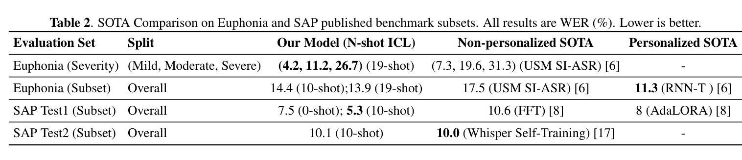 针对口齿不清(dysarthric speech)的语音识别问题,提出一种混合元训练法。此方法在一单模型上即可实现零样本或少样本实时个性化,通过上下文学习(ICL)提升性能。在最新子集上测量词错误率(WER),模型在Euphonia上的表现优于非个性化基线并接近个性化模型,同时在SAP Test 1上的表现显著优于个性化适配器。此外,还强调了样本选择的重要性,并展示了通过优化选择方法可提高效率。最后,通过数据消融实验验证了该方法的数据效率。本研究提供了一种实用、可扩展且个性化的解决方案。