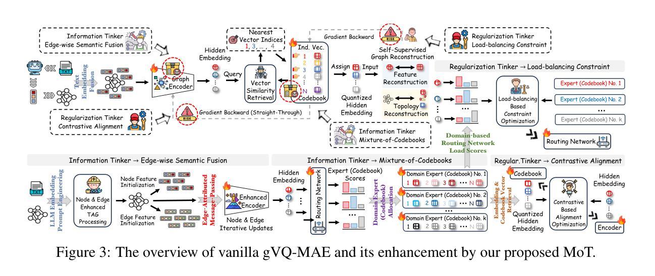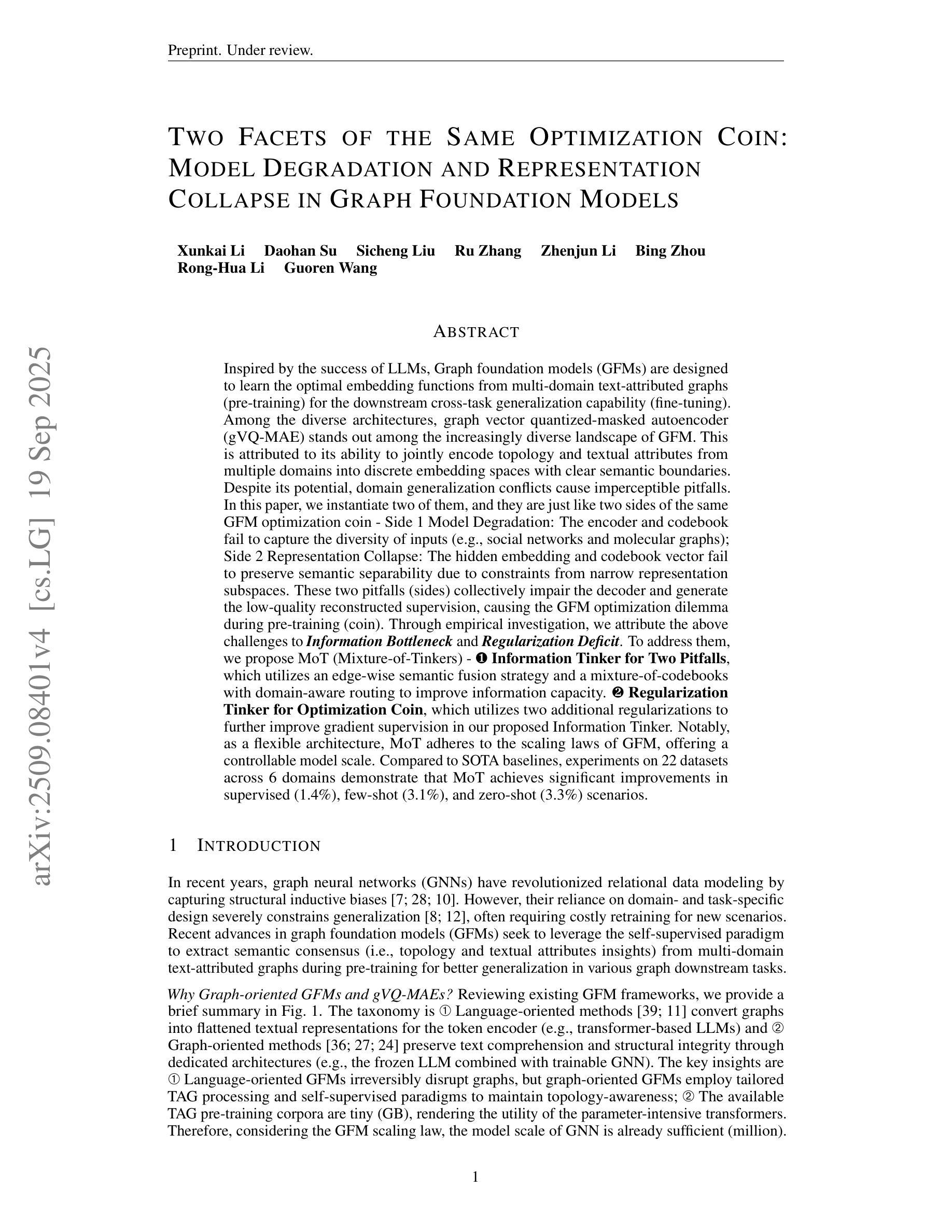 受到大型语言模型(LLMs)成功的启发,图神经网络模型(GFMs)被设计用于从多域文本属性图中学习最优嵌入函数,以用于下游跨任务泛化能力。在多种架构中,图VQ-MAE在众多日益多样化的GFM领域中脱颖而出。这归功于其能够将多个领域的拓扑和文本属性联合编码到具有清晰语义边界的离散嵌入空间中的能力。尽管如此,领域泛化冲突还是会导致一些不易察觉的陷阱。在本文中,我们实例化了两个这样的陷阱,它们就像是GFM优化同一枚硬币的两面——第一面是模型退化:编码器和代码本无法捕捉输入的多样性;第二面是表示崩溃:由于来自狭窄表示子空间的约束,隐藏嵌入和代码本向量无法保持语义可分性。这两个陷阱(两面)共同影响了解码器,并产生了低质量重建的监督信息,导致了预训练过程中的GFM优化困境(硬币)。通过实证研究,我们将上述挑战归因于信息瓶颈和正则化缺陷。为了解决这些问题,我们提出了MoT方法:(1)针对两个陷阱的信息微调策略,它利用边缘语义融合策略和混合代码本以及域感知路由来提高信息容量;(2)针对优化硬币的正则化微调策略,它利用两种额外的正则化方法来进一步改进我们提出的信息微调中的梯度监督。值得注意的是,作为一个灵活的架构,MoT遵循GFM的扩展定律,提供了一个可控的模型规模。在6个领域的22个数据集上的实验表明,与最新技术基准相比,MoT在监督学习、小样本学习和零样本学习场景中实现了显著改进。