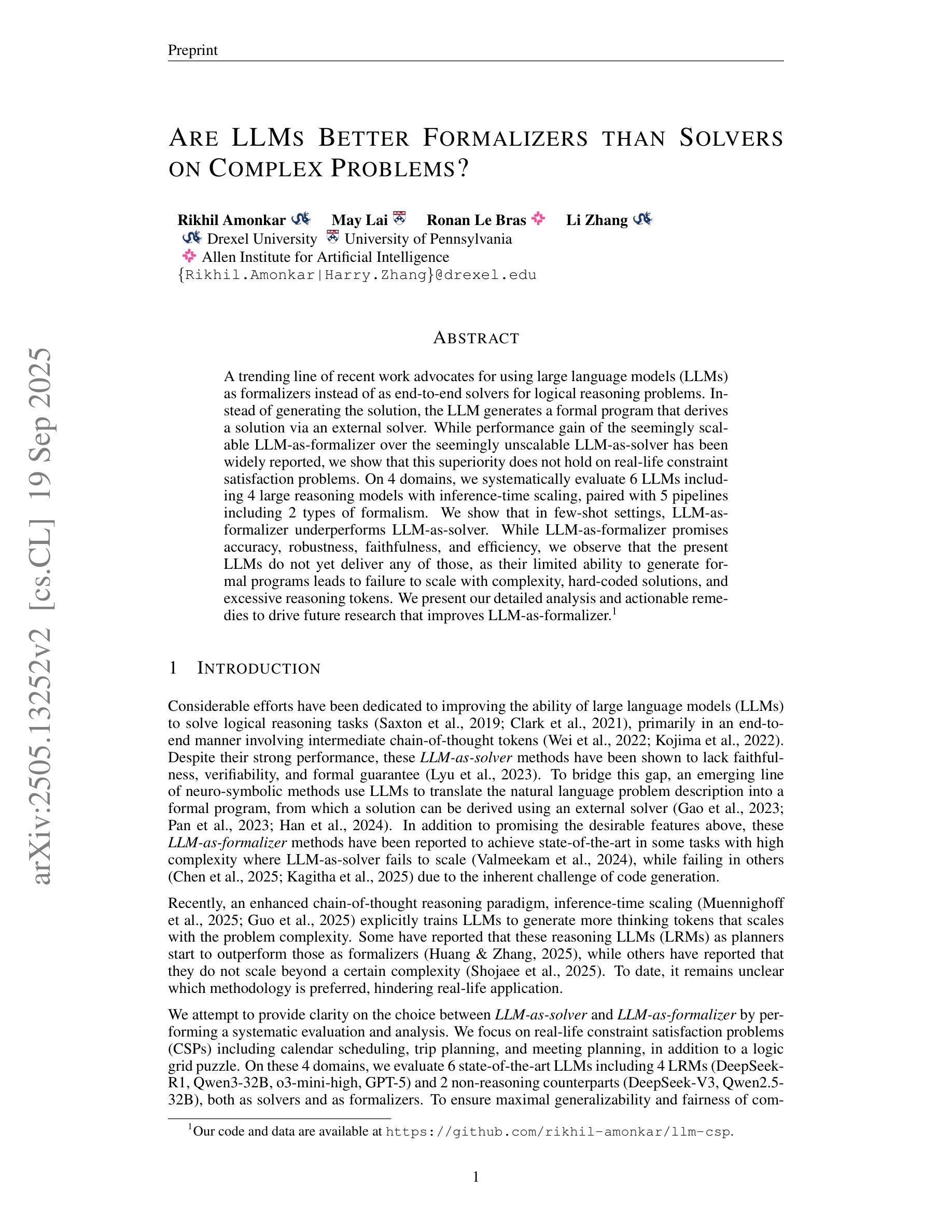 - 在少数场景下,LLM作为形式化工具的表现不如作为求解器。