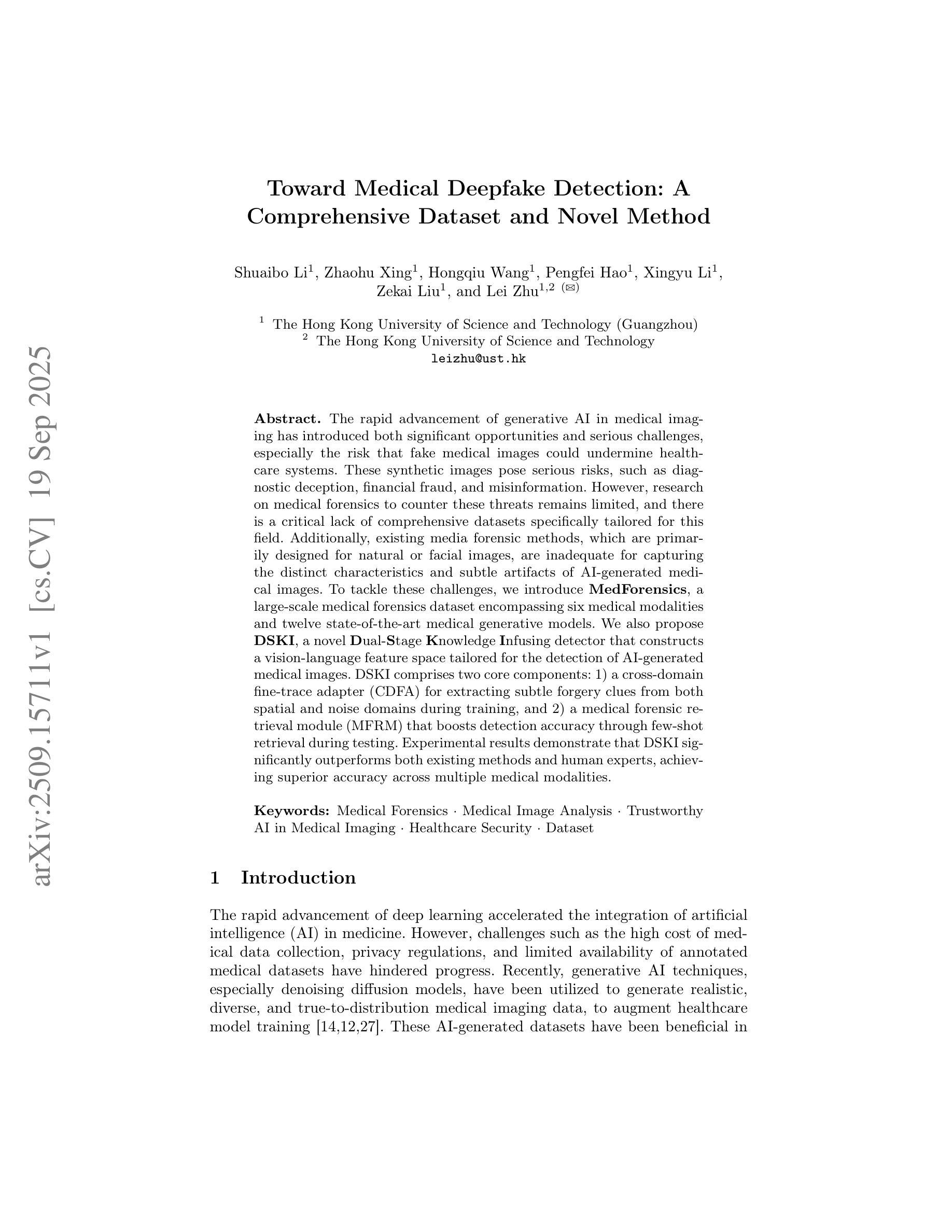 医学成像领域生成式人工智能的快速进步带来了重要机遇和严峻挑战,特别是虚假医学图像可能破坏医疗系统的风险。这些合成图像可能造成诊断欺骗、金融欺诈和误导信息等严重风险。然而,针对这些威胁的医学研究仍受限于专门的综合数据集。现有媒体鉴定方法主要用于自然图像或面部图像,无法捕捉医学图像AI生成物的独特特征和细微痕迹。为应对这些挑战,我们推出MedForensics数据集,涵盖六种医学模态和十二种最先进的医学生成模型的大规模医学鉴定数据集。同时提出DSKI检测器,构建专门用于检测AI生成的医学图像的视觉语言特征空间。实验结果表明,DSKI在多个医学模态上的检测精度显著优于现有方法和人类专家。