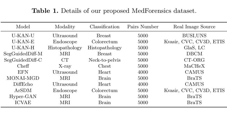 - 推出MedForensics数据集,涵盖多种医学模态和先进的生成模型,为医学鉴定提供大规模资源。