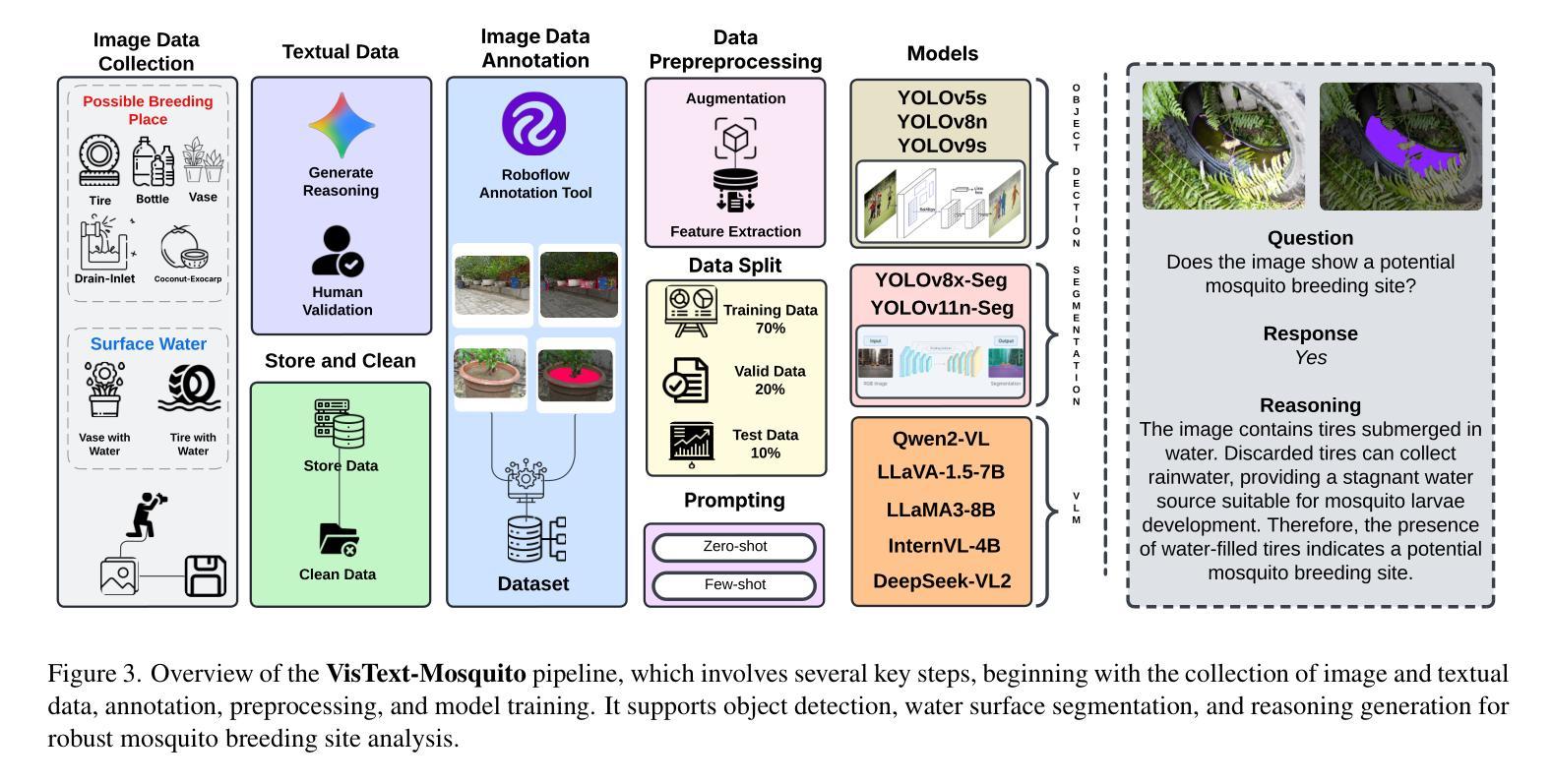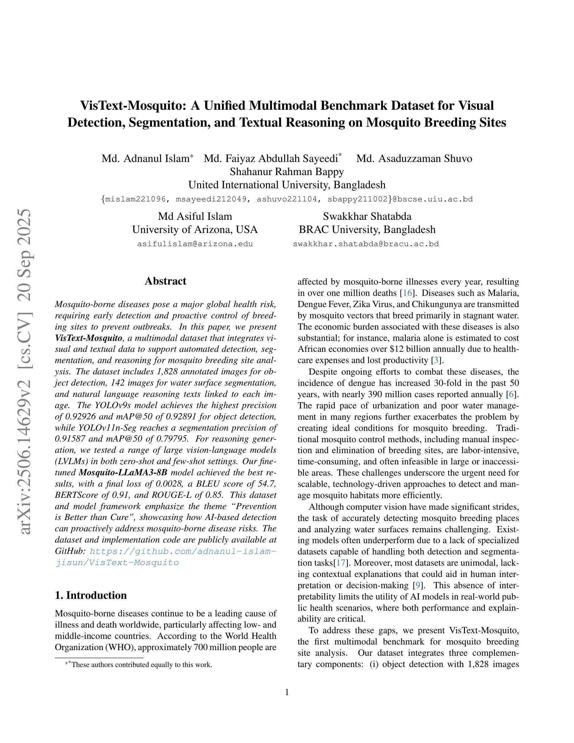 蚊虫传播的疾病构成了全球性的重大健康威胁,需要提前检测和积极控制繁殖地点以防止爆发。在本文中,我们介绍了VisText-Mosquito,这是一个多模式数据集,融合了视觉和文本数据,支持蚊子繁殖地点分析的自动化检测、分割和推理。该数据集包含1828张用于目标检测的注释图像、142张用于水面分割的图像以及与每张图像相关的自然语言推理文本。YOLOv9s模型在目标检测方面达到了0.92926的精度和0.92891的mAP@50,而YOLOv11n-Seg在分割精度上达到了0.91587,mAP@50为0.79795。对于推理生成,我们在零样本和少样本环境中测试了一系列大型视觉语言模型(LVLMs)。我们微调的Mosquito-LLaMA3-8B模型取得了最佳结果,最终损失为0.0028,BLEU得分为54.7,BERTScore为0.91,ROUGE-L为0.85。该数据集和模型框架突出了“预防胜于治疗”的主题,展示了基于AI的检测如何积极应对蚊虫传播疾病的风险。数据集和实现的代码已公开发布在GitHub上:https://github.com/adnanul-islam-jisun/VisText-Mosquito