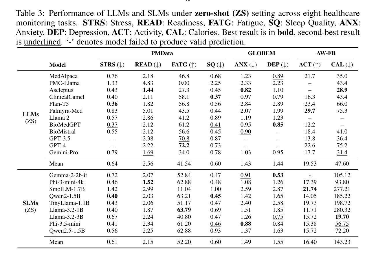 - SLMs在健康预测任务中的表现与大型语言模型相当。
