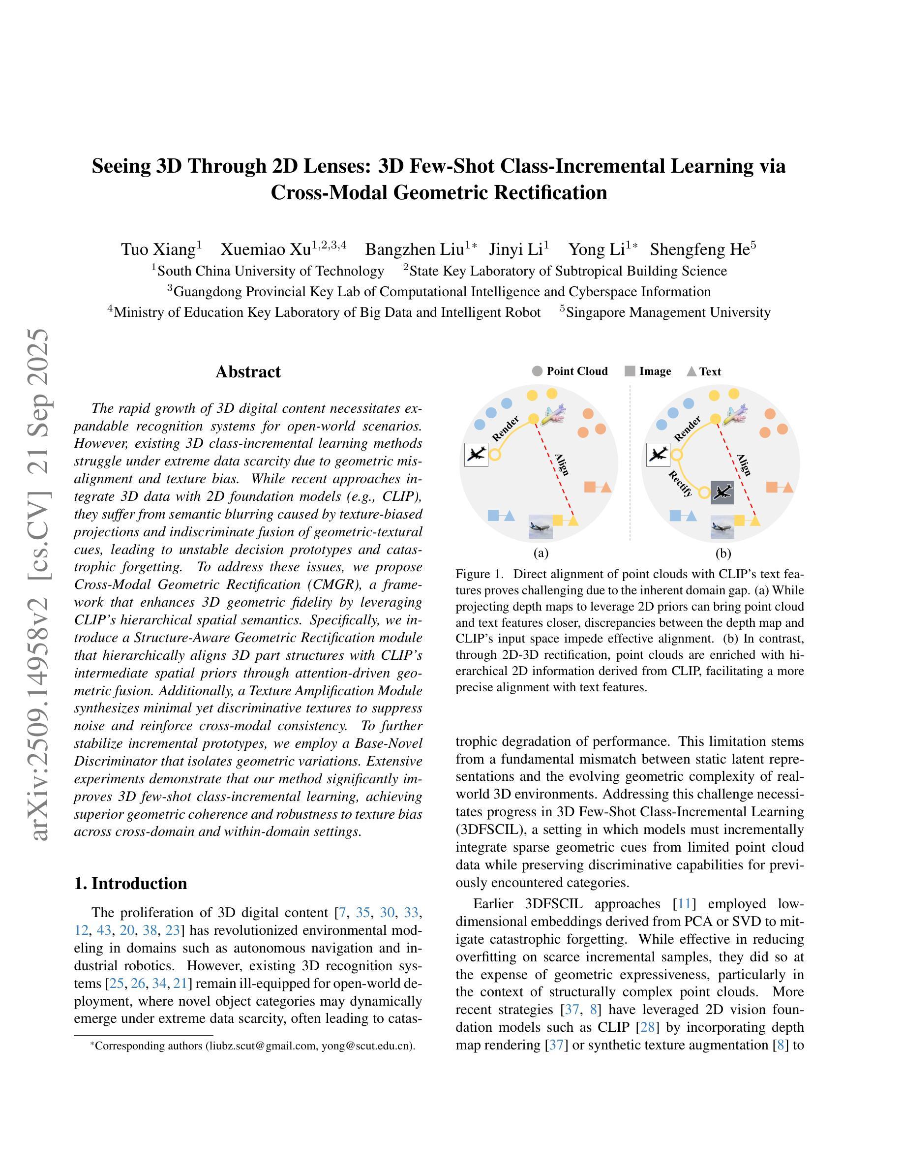 本文探讨了三维数字内容的快速增长对开放世界场景下的识别系统提出的新需求。现有三维类增量学习方法在极端数据稀缺情况下存在几何失配和纹理偏差的问题。文章通过整合三维数据与二维基础模型(如CLIP)来解决这一问题,但存在语义模糊的问题。为此,本文提出了跨模态几何校正(CMGR)框架,通过利用CLIP的分层空间语义来提高三维几何保真度。该框架包括结构感知几何校正模块和纹理放大模块,分别实现三维部分结构与CLIP中间空间先验的层次对齐以及最小判别性纹理的合成,以抑制噪声并增强跨模态一致性。此外,为了稳定增量原型,还采用了基础-新颖鉴别器来隔离几何变化。实验证明,该方法显著提高了三维小样本类增量学习的几何一致性和对纹理偏差的鲁棒性。