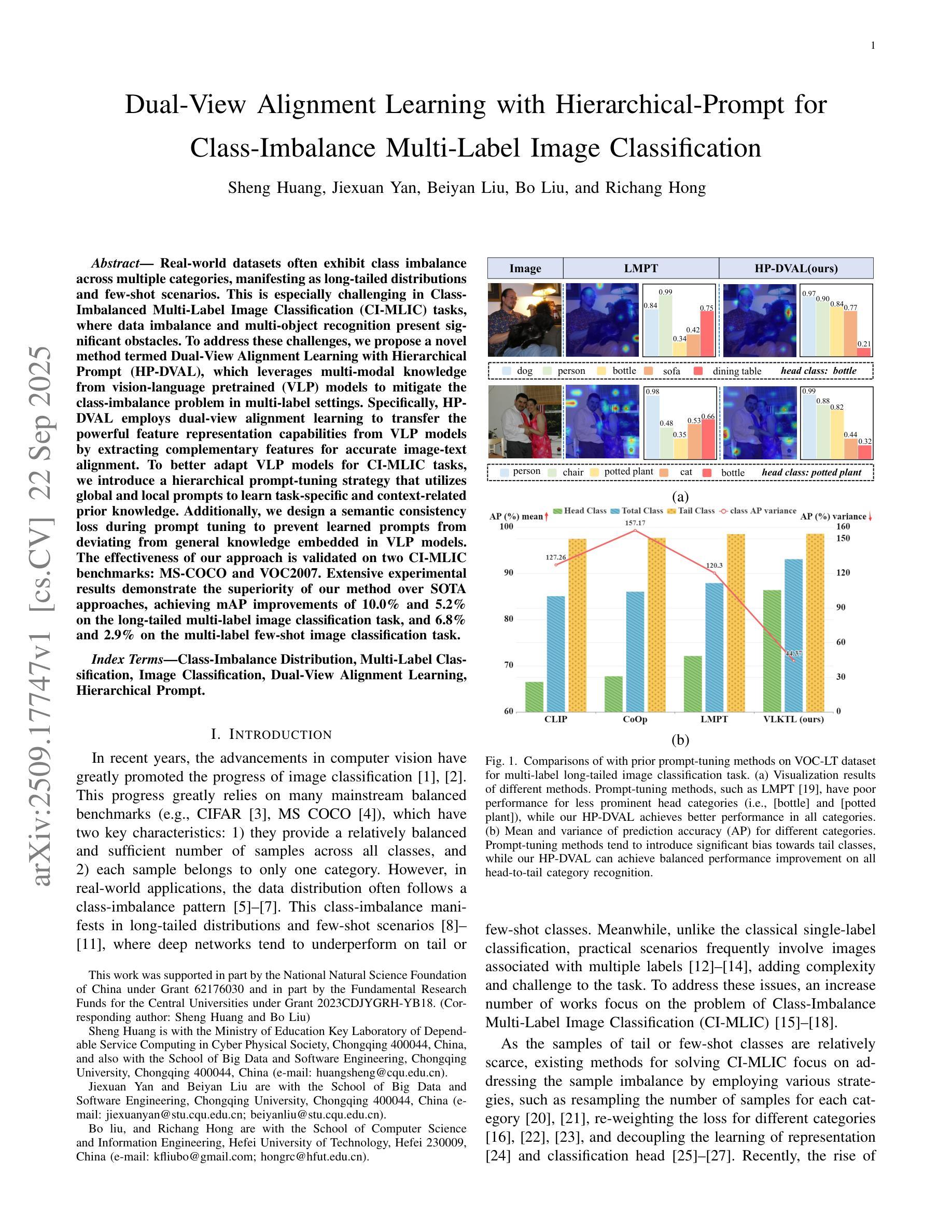 该文针对现实世界数据集中常见的类别不平衡问题,特别是在多标签图像分类中的挑战,提出了一种新的方法——基于层次提示的双视对齐学习(HP-DVAL)。该方法利用视觉语言预训练(VLP)模型的多模态知识,通过双视对齐学习技术提取互补特征,实现图像与文本的准确对齐,以缓解类别不平衡问题。同时,引入层次提示调整策略,利用全局和局部提示来学习和适应特定任务和上下文相关的先验知识。在MS-COCO和VOC2007两个多标签图像分类基准测试上的实验结果表明,该方法相较于现有方法表现优越,在长尾多标签图像分类任务上的mAP提升10.0%和5.2%,在多标签少样本图像分类任务上的mAP提升6.8%和2.9%。