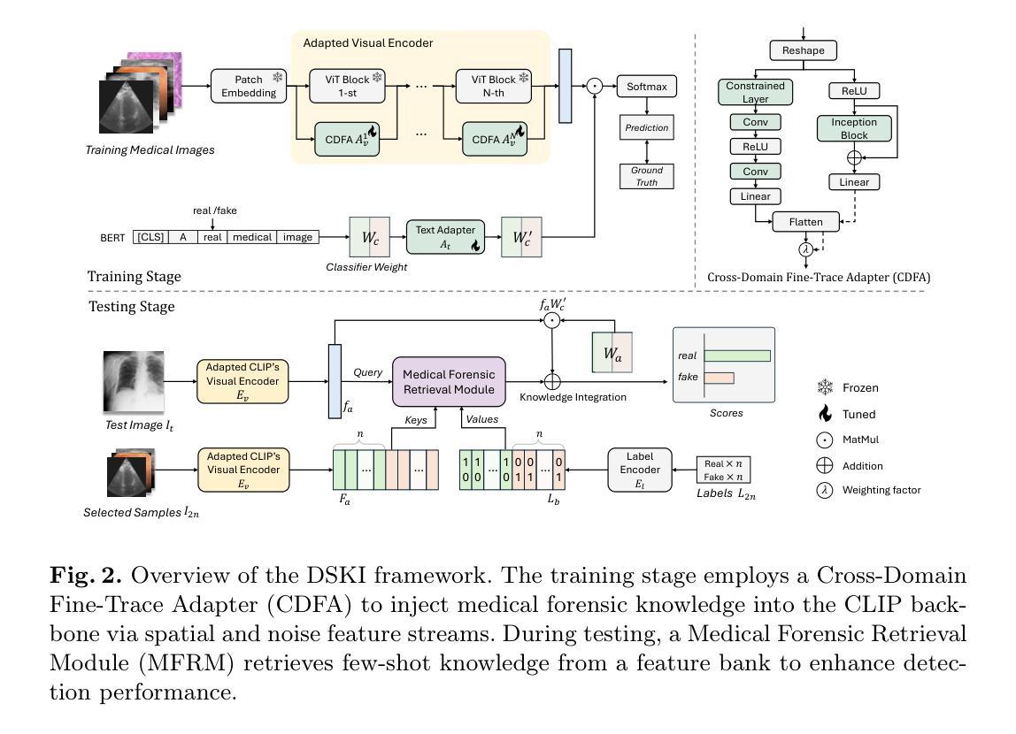- 提出DSKI检测器,通过双阶段知识注入(DSKI)构建专门的视觉语言特征空间用于检测AI生成的医学图像。