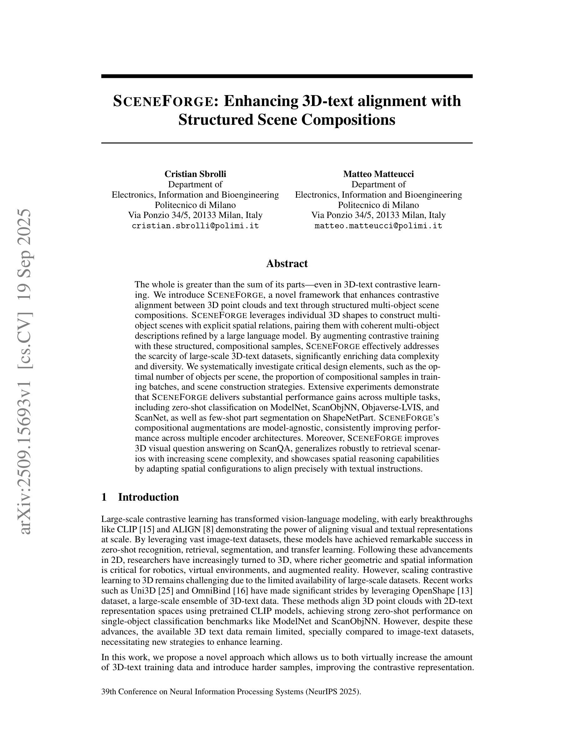 The whole is greater than the sum of its parts-even in 3D-text contrastive learning. We introduce SceneForge, a novel framework that enhances contrastive alignment between 3D point clouds and text through structured multi-object scene compositions. SceneForge leverages individual 3D shapes to construct multi-object scenes with explicit spatial relations, pairing them with coherent multi-object descriptions refined by a large language model. By augmenting contrastive training with these structured, compositional samples, SceneForge effectively addresses the scarcity of large-scale 3D-text datasets, significantly enriching data complexity and diversity. We systematically investigate critical design elements, such as the optimal number of objects per scene, the proportion of compositional samples in training batches, and scene construction strategies. Extensive experiments demonstrate that SceneForge delivers substantial performance gains across multiple tasks, including zero-shot classification on ModelNet, ScanObjNN, Objaverse-LVIS, and ScanNet, as well as few-shot part segmentation on ShapeNetPart. SceneForge’s compositional augmentations are model-agnostic, consistently improving performance across multiple encoder architectures. Moreover, SceneForge improves 3D visual question answering on ScanQA, generalizes robustly to retrieval scenarios with increasing scene complexity, and showcases spatial reasoning capabilities by adapting spatial configurations to align precisely with textual instructions.