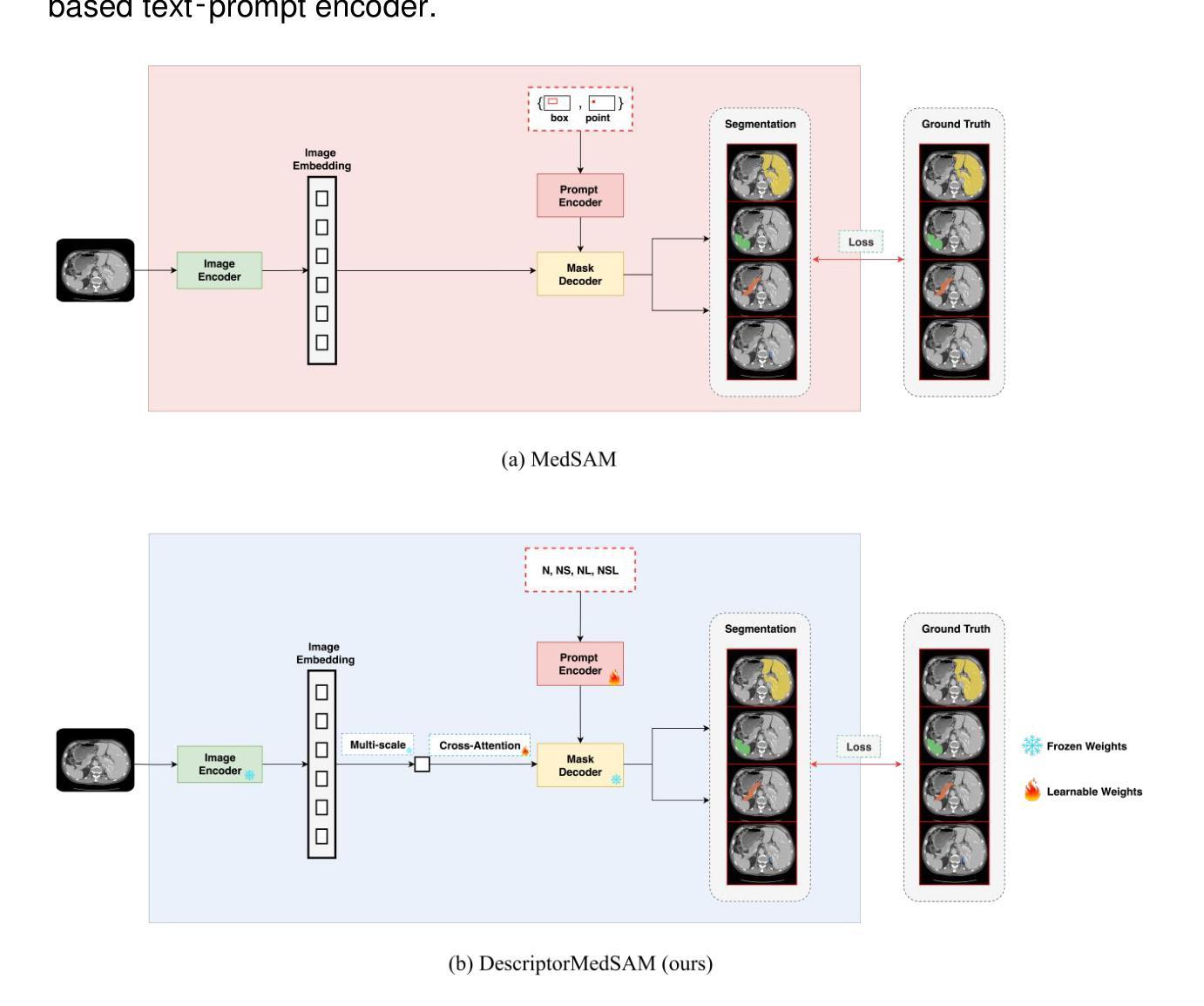 - DescriptorMedSAM是MedSAM的轻量级扩展,可结合结构化文本提示实现无需点击的分割。