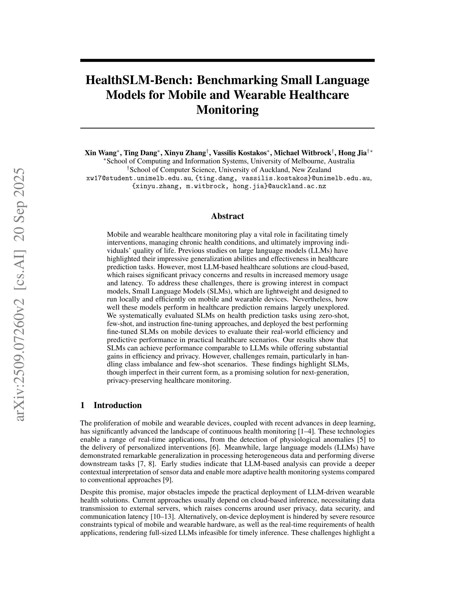 移动和可穿戴式健康监测在促进及时干预、管理慢性健康状况以及提高个人生活质量方面发挥着重要作用。针对大型语言模型在医疗保健预测任务中的隐私和效率问题,研究界转向研究小型语言模型(SLMs)。本文通过系统地评估SLMs在健康预测任务中的表现,发现其在零样本、少样本和指令微调等任务中的表现与大型语言模型相当,且在实际部署时表现出较高的效率和隐私保护能力。然而,处理类别不平衡和少样本场景仍存在挑战。总体而言,小型语言模型是下一代隐私保护健康监测的有前途的解决方案。