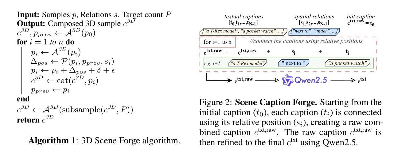 - 通过构建具有明确空间关系的多对象场景,SceneForge解决了大规模3D-文本数据集的稀缺问题。