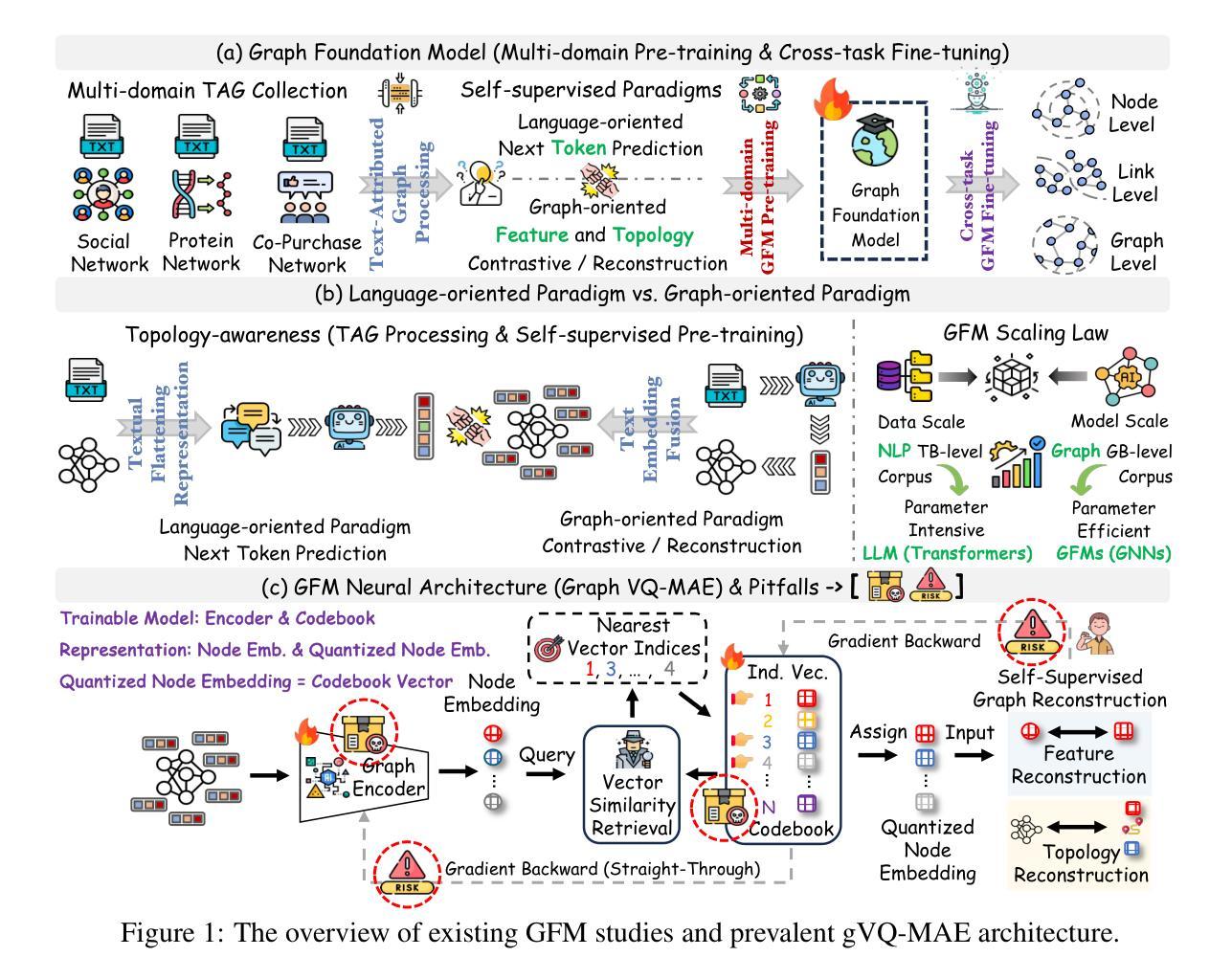 - 图VQ-MAE是GFMs中的突出架构,能够联合编码多个领域的拓扑和文本属性到离散嵌入空间。