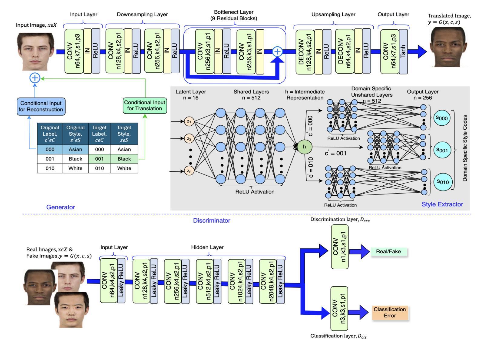 - 研究采用生成对抗网络(GANs)进行多领域图像到图像的转换,旨在实现种族特征的翻译。