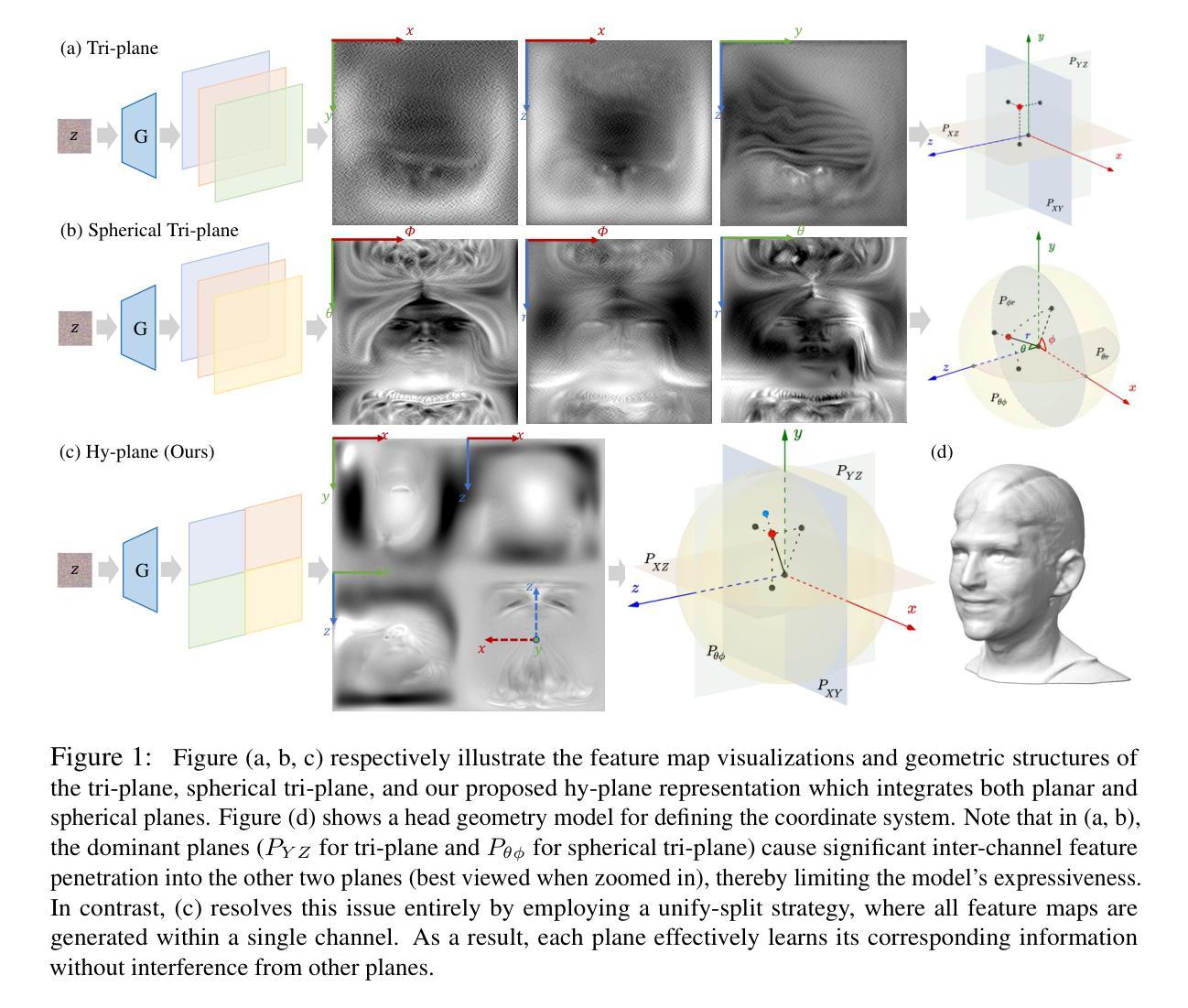 基于三角平面的表示方法因其高效性在三维生成对抗网络(GANs)中广泛应用于头部图像合成和其他三维物体/场景建模任务。然而,通过笛卡尔坐标投影查询特征往往会导致特征纠缠,从而产生镜像伪影。最近的一项工作SphereHead试图通过引入基于球形坐标系统的球形三角平面来解决这个问题。虽然它成功地减轻了特征纠缠问题,但SphereHead在方形特征图与球形平面之间的映射不均匀,导致渲染时特征图的有效利用率降低,难以生成精细的图像细节。此外,无论是三角平面还是球形三角平面表示都存在一个微妙而持久的问题:卷积通道间的特征穿透会干扰平面间关系,特别是当一个平面占据主导地位时。这些挑战共同阻碍了基于三角平面的方法发挥潜力。在本文中,我们首次系统地分析了这些问题并提出了创新的解决方案。具体来说,我们引入了一种新型混合平面(简称hy-plane)表示法,它结合了平面和球形平面的优点,避免了各自的缺点。我们进一步通过采用新型近等面积弯曲策略取代了传统的theta-phi弯曲,以最大化方形特征图的有效利用率。此外,我们的生成器合成了一个单通道的统一特征图,而不是多个单独通道的特征图,从而有效地消除了特征穿透。经过一系列的技术改进,我们的hy-plane表示法使我们的方法HyPlaneHead在全头图像合成中达到了最先进的性能。