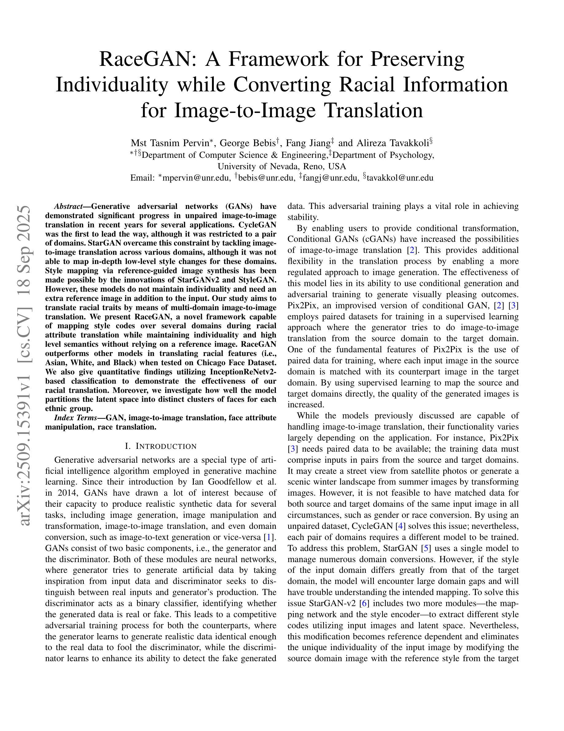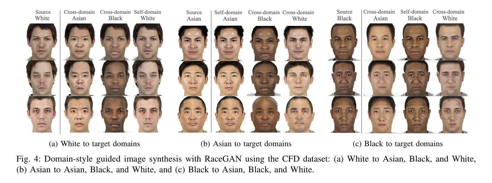 生成对抗网络(GANs)近年来在多种应用的非配对图像到图像转换方面取得了显著进展。虽然CycleGAN率先引领了这一方向,但它仅限于两个领域的转换。StarGAN突破了这一限制,解决了跨多个领域的图像到图像转换问题,但它无法对这些领域的深层低级风格变化进行映射。通过StarGANv2和StyleGAN的创新,通过参考引导图像合成进行风格映射已成为可能。然而,这些模型不能保持个性,除了输入图像外还需要额外的参考图像。我们的研究旨在通过多领域图像到图像转换进行种族特征转换。我们提出了RaceGAN,这是一个新型框架,能够在种族属性转换过程中映射多个领域的风格代码,同时保持个性并依赖高级语义而无需参考图像。在芝加哥面部数据集上进行测试时,RaceGAN在翻译种族特征(如亚洲人、白人和黑人)方面优于其他模型。我们还使用基于InceptionReNetv2的分类方法进行定量研究,以证明我们种族翻译的有效性。此外,我们还调查了模型如何将潜在空间划分成每个民族群体的不同面部集群。