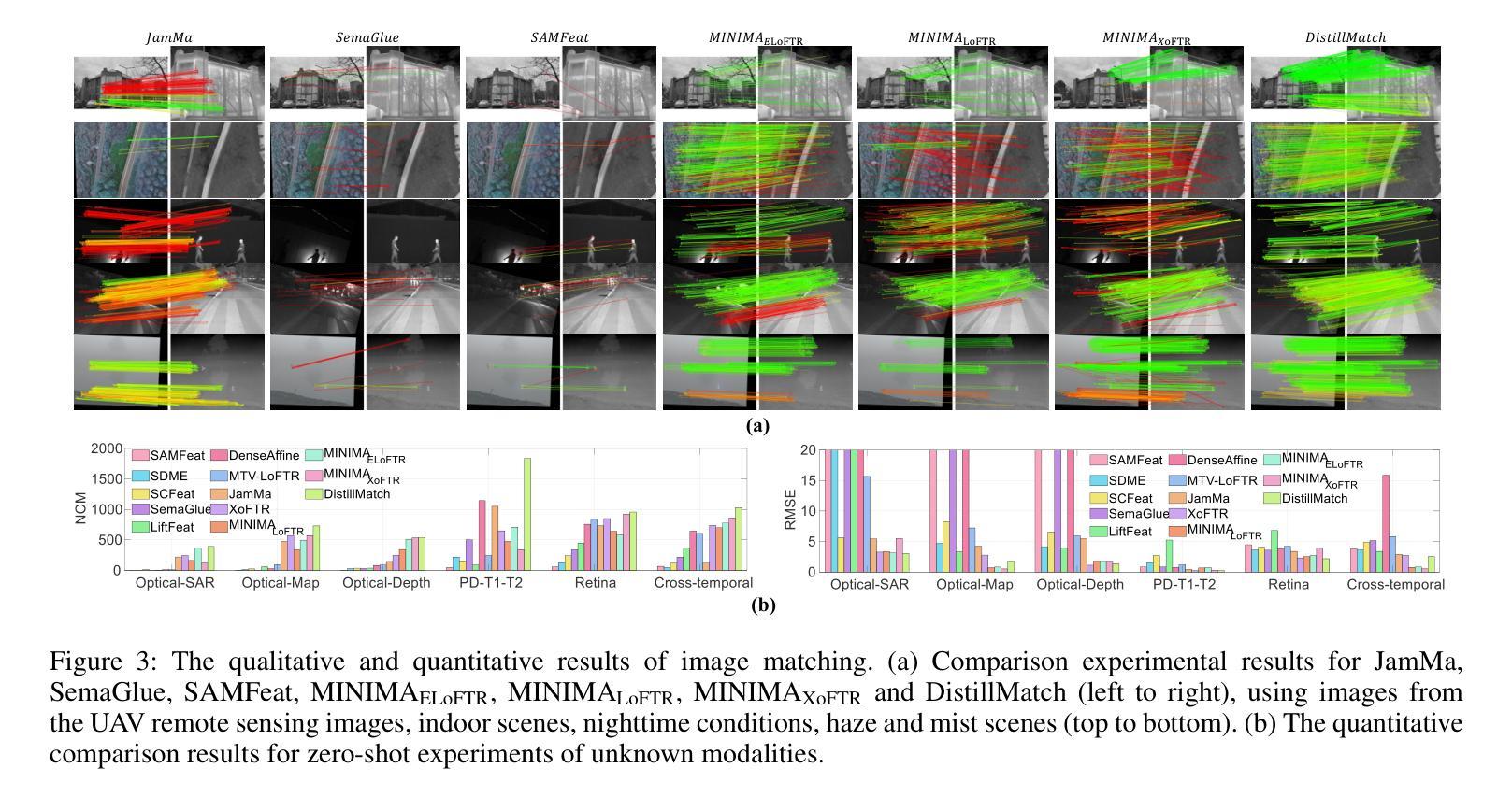 多模态图像匹配旨在寻找不同模态图像之间的像素级对应关系,这对于跨模态感知、融合和分析至关重要。然而,不同模态之间显著的外观差异使这项任务具有挑战性。由于高质量标注数据集的稀缺,现有的深度学习匹配方法提取模态通用特征的表现不佳,并且缺乏对多种场景的适应性。视觉基础模型(VFM)在大规模数据上进行训练,可以产生可推广和适应各种模态数据和任务的特征表示,包括多模态匹配。因此,我们提出了使用知识蒸馏的DistillMatch多模态图像匹配方法。DistillMatch采用知识蒸馏技术构建了一个轻量级的学生模型,该模型可以从VFM(包括DINOv2和DINOv3)提取高级语义特征,以协助跨模态匹配。为了保留模态特定信息,它将模态类别信息提取并注入到其他模态的特征中,增强了模型对跨模态关联的理解。此外,我们设计了V2I-GAN,通过将从可见光图像转换为伪红外图像来进行数据增强,以提高模型的泛化能力。实验表明,DistillMatch在公共数据集上的性能优于现有算法。