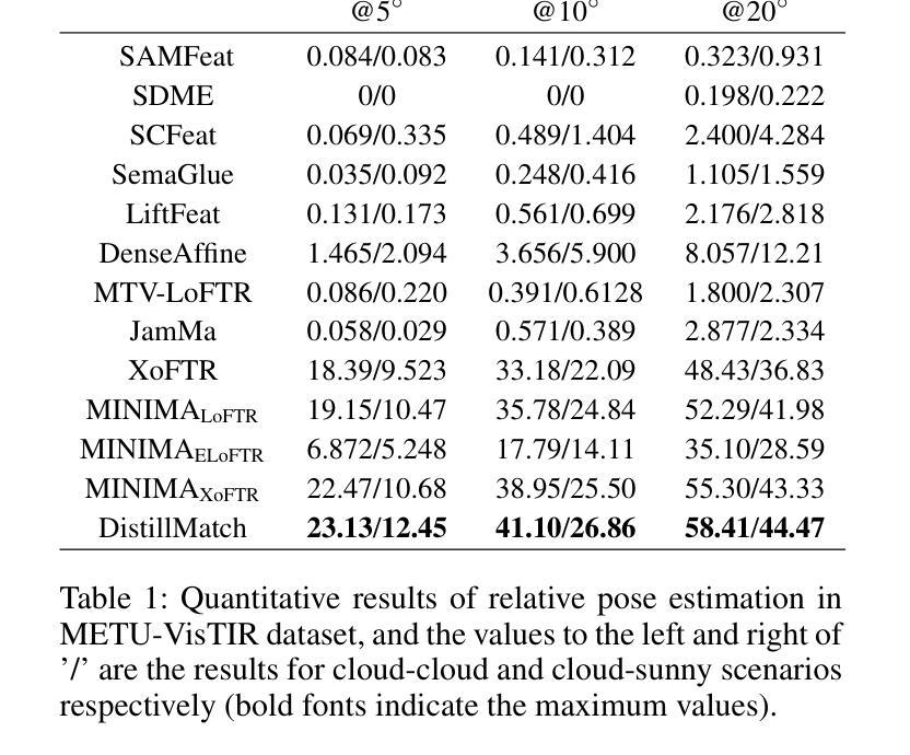 基于大规模数据集训练的Vision Foundation Model(VFM)可有效实现多模态图像匹配。针对跨模态匹配难题,提出DistillMatch方法,利用知识蒸馏技术从VFM中构建轻量级学生模型,提取高语义特征进行匹配。同时结合模态类别信息增强模型对跨模态关联的理解,并通过V2I-GAN提升模型的泛化能力。实验表明,DistillMatch在公开数据集上优于现有算法。