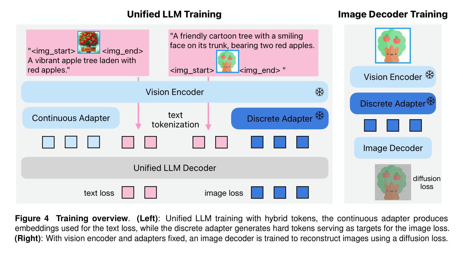 - 统一的自回归LLM预测文本和图像的高级语义。