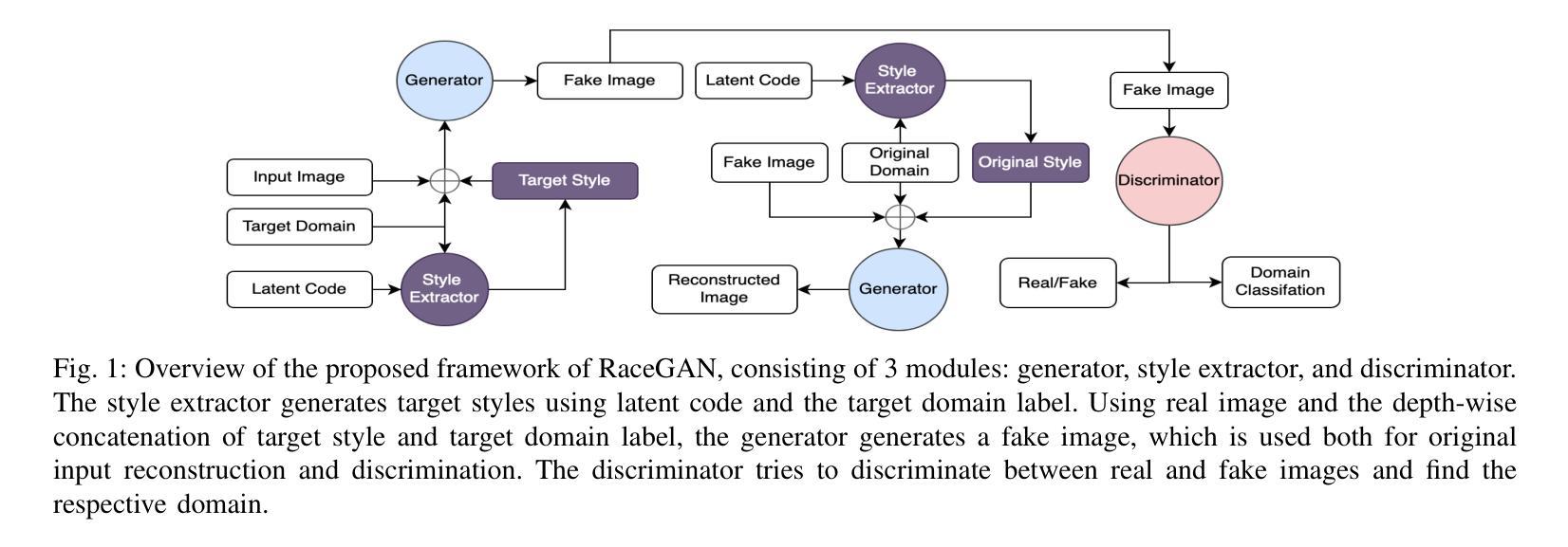 生成对抗网络(GANs)在近年来在无配对图像到图像转换中取得了显著进展,并应用于多个领域。虽然CycleGAN率先实现了图像转换,但它仅限于两个领域之间的转换。StarGAN突破了这一限制,实现了跨多个领域的图像到图像转换,但在深度低层次的风格变化映射上仍有不足。StyleGAN和StarGANv2实现了参考引导图像合成的风格映射,但这些模型未能保持个性且需要额外的参考图像。本研究旨在通过多领域图像到图像转换进行种族特征转换。我们提出了RaceGAN,这是一种新型框架,能够在种族属性转换过程中映射多个领域的风格代码,同时保持个性且无需依赖参考图像。在芝加哥面部数据集上进行的测试表明,RaceGAN在翻译种族特征(如亚洲人、白人和黑人)方面优于其他模型。我们还使用基于InceptionReNetv2的分类方法给出了定量研究结果来证明我们的种族翻译的有效性。此外,我们还调查了模型如何将面部潜在空间划分为不同族群的不同集群的程度。总的来说,本文展示了RaceGAN在种族特征转换方面的优异性能和创新性技术贡献。