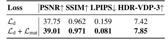 - 通过新型损失函数引导,PhysHDR能够融入场景中表面的材料属性。
