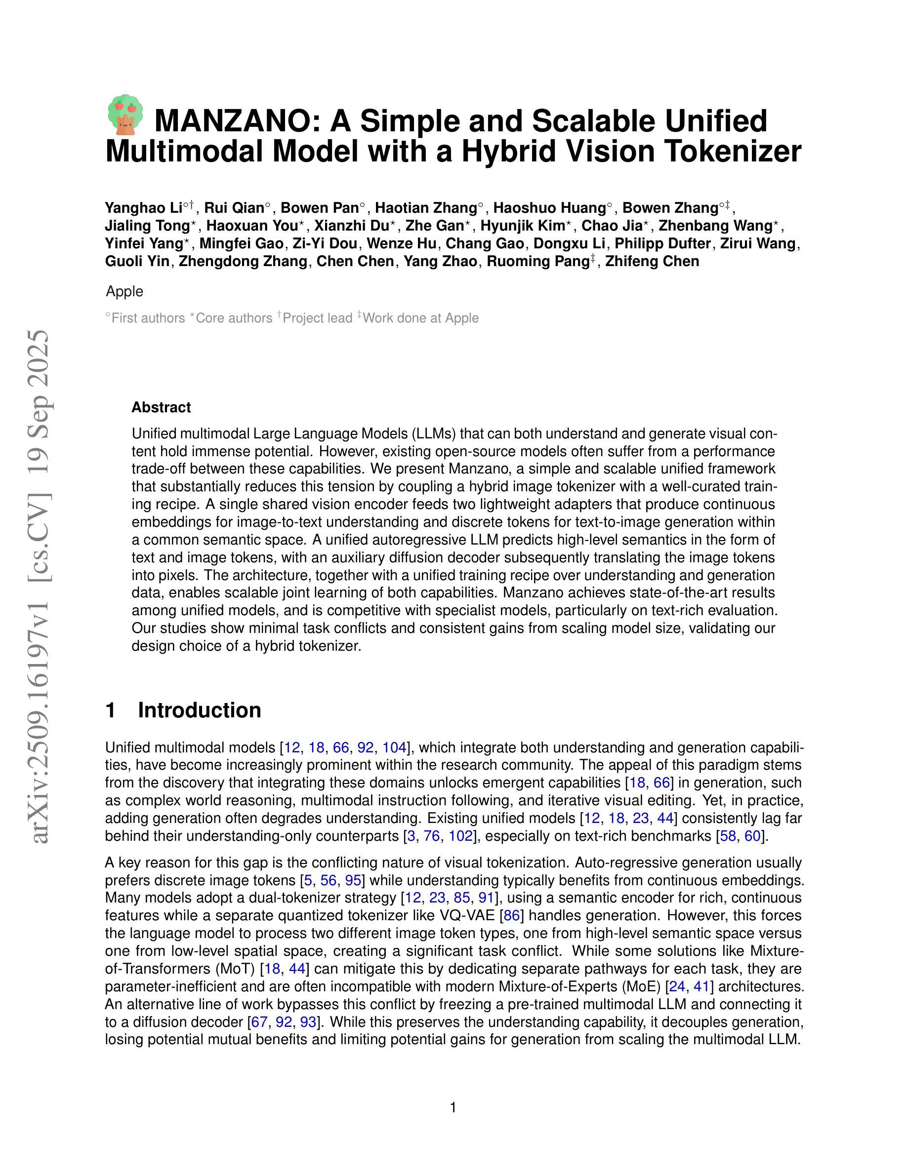具有理解和生成视觉内容能力的统一多模态大型语言模型(LLM)具有巨大的潜力。然而,现有的开源模型通常在这两种能力之间面临性能权衡的问题。我们推出了Manzano,这是一个简单且可扩展的统一框架,通过混合图像标记器与精心策划的训练方案相结合,大幅减少了这种紧张关系。单个共享视觉编码器为两个轻量级适配器提供信息,这两个适配器分别产生用于图像到文本理解的连续嵌入和用于文本到图像生成的离散令牌,它们位于同一语义空间中。统一的自回归LLM预测文本和图像令牌的高级语义,随后辅助扩散解码器将图像令牌转换为像素。该架构与理解和生成数据上的统一训练方案相结合,实现了两种能力的可扩展联合学习。Manzano在统一模型中实现了最先进的成果,并且在专业模型中具有竞争力,特别是在文本丰富的评估中。我们的研究表明任务冲突最小,并且从扩大模型规模中获得了持续的收益,这验证了我们的混合标记器设计选择。