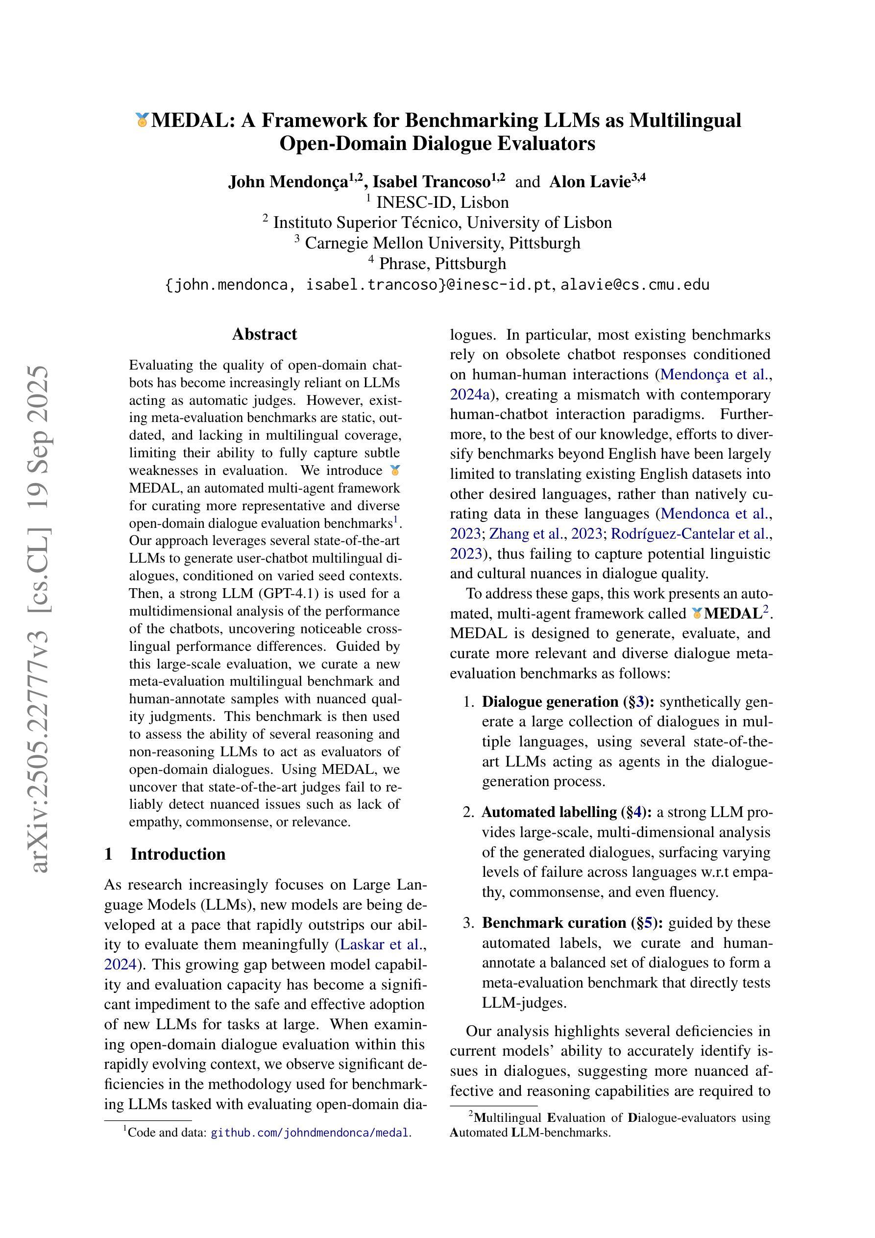 评估开放领域聊天机器人的质量越来越依赖于作为自动裁判的大型语言模型(LLMs)。然而,现有的元评估基准测试是静态的、过时的,并且缺乏多语言覆盖,限制了它们全面捕捉评估中细微弱点的能力。我们介绍了 MEDAL,这是一个自动化的多代理框架,用于创建更具代表性和多样性的开放领域对话评估基准测试。我们的方法利用若干先进的大型语言模型来生成基于不同种子语境的用户聊天机器人多语言对话。然后,使用强大的大型语言模型(GPT-4.1)对聊天机器人的性能进行多维分析,发现显著的语言间性能差异。在这一大规模评估的指导下,我们创建了一个新的元评估多语言基准测试,并对样本进行了微妙的品质判断进行人工标注。此基准测试然后用于评估多个理性与非理性的大型语言模型在作为开放领域对话评估器时的能力。使用 MEDAL,我们发现最先进的裁判在可靠检测诸如缺乏同理心、常识或关联性等微妙问题上存在不足。