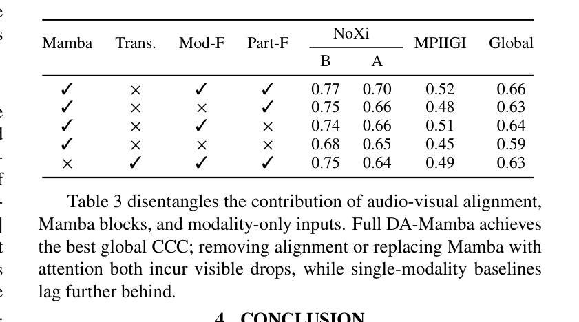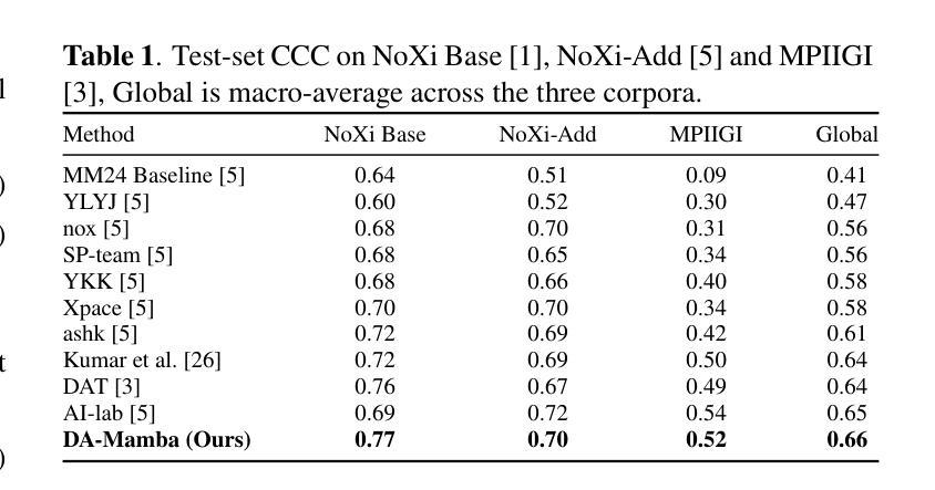 - 在标准基准测试上,DA-Mamba超过现有最佳方法,提高了一致性相关系数(CCC)。