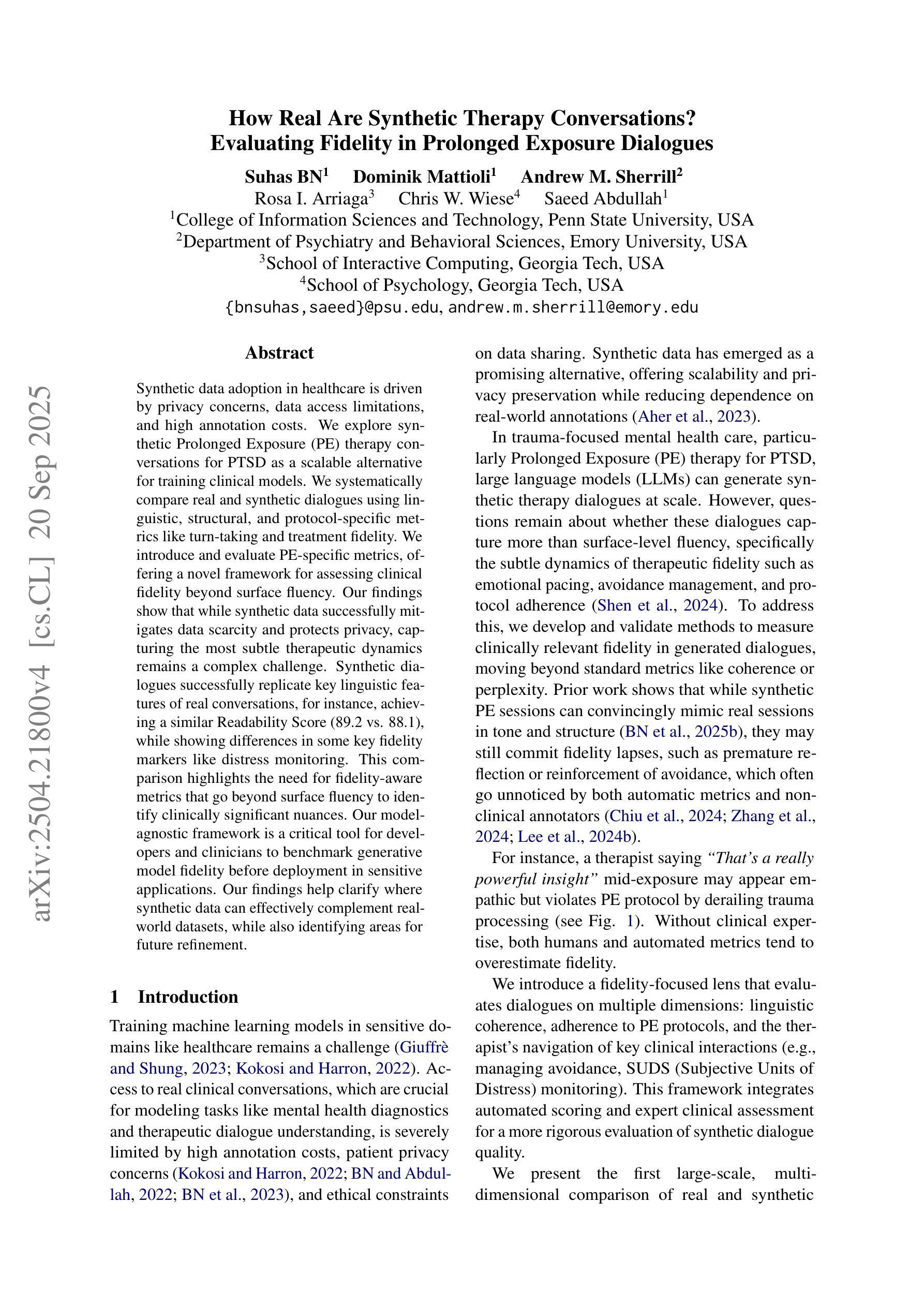 医疗保健领域采用合成数据是出于隐私担忧、数据访问限制和高标注成本的驱动。我们探索了合成延长暴露(PE)疗法对话作为训练临床模型的可扩展替代方案,用于治疗创伤后应激障碍(PTSD)。我们系统地使用语言、结构和协议特定指标(如轮流和治疗效果的忠实度)比较真实和合成的对话。我们引入并评估了PE特定指标,为评估临床忠实度提供了一个超越表面流利的新框架。我们的研究发现,虽然合成数据成功地缓解了数据稀缺问题并保护了隐私,但捕捉最微妙的疗法动态仍然是一个复杂的挑战。合成对话成功复制了真实对话的主要语言特征,例如,达到了类似的阅读得分(89.2比88.1),在某些关键忠实度标记(如压力监测)方面显示出差异。这种比较凸显了忠实度感知指标的需要,这些指标超越表面流利度,能够识别临床上重要的细微差别。我们的模型无关框架是开发者和临床医生在敏感应用部署之前评估生成模型忠实度的关键工具。我们的发现有助于澄清合成数据在哪些情况下可以有效地补充真实世界数据集,同时也确定了未来改进的领域。