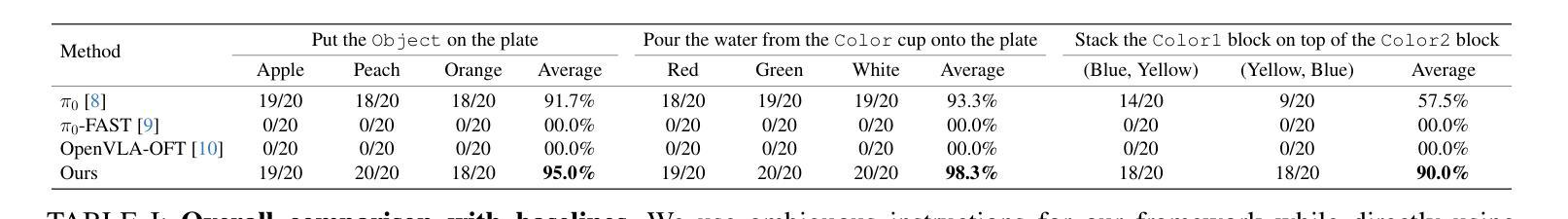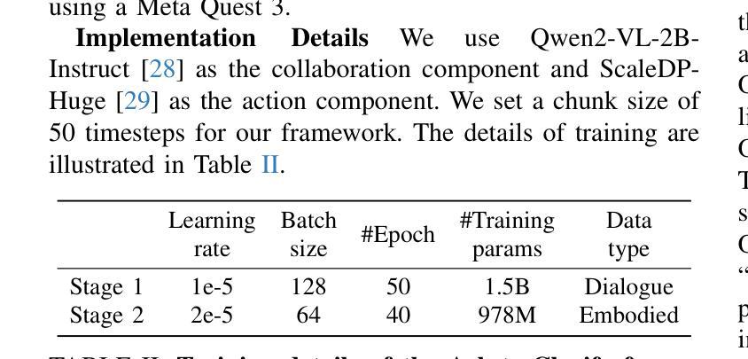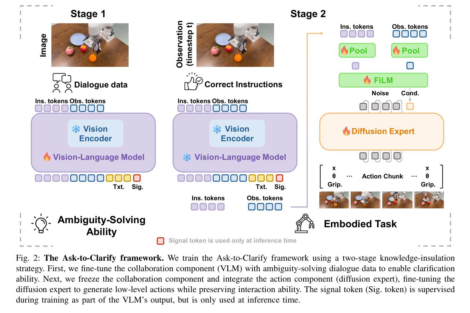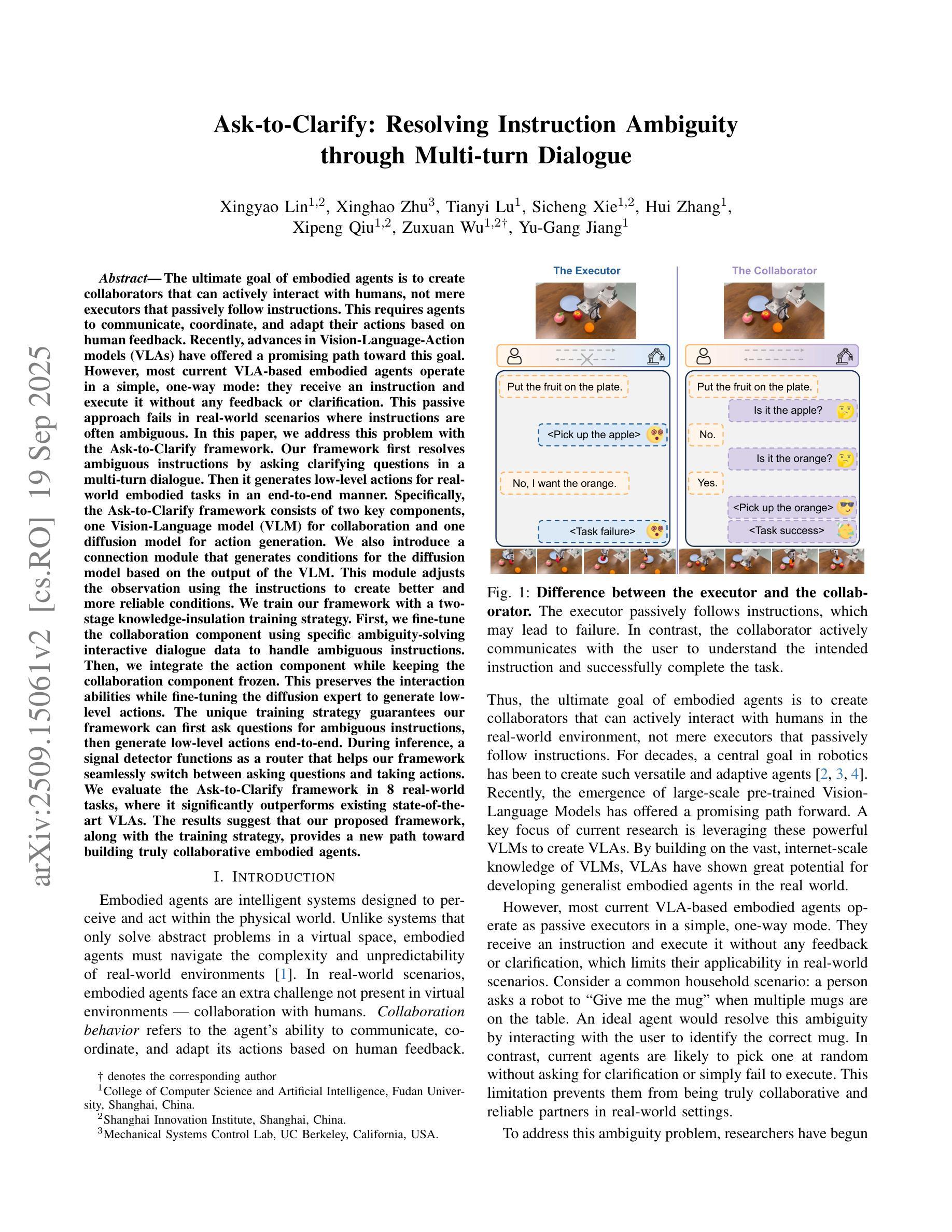 实现与人类协作的体感智能体,要求智能体能与人沟通、协调并根据人类反馈调整行动。本文提出了一个解决现实问题——基于视觉感知与语言理解的体感智能体通常是一维模式操作的问题,即只能接收指令并执行,缺乏反馈机制。为解决此问题,本文提出了“问询澄清框架”,它能在多轮对话中解决模糊指令问题并生成低层次行动。该框架包括两个组件:一个用于协作的视觉语言模型和用于行动扩散模型,同时引入一个连接模块,基于视觉语言模型的输出为扩散模型生成条件。采用两阶段知识绝缘策略训练框架,先微调协作组件处理模糊性,再整合行动组件。评估结果显示,在八个真实任务中,“问询澄清框架”优于现有最先进的视觉感知与语言理解技术,为构建协作式体感智能体提供了途径。