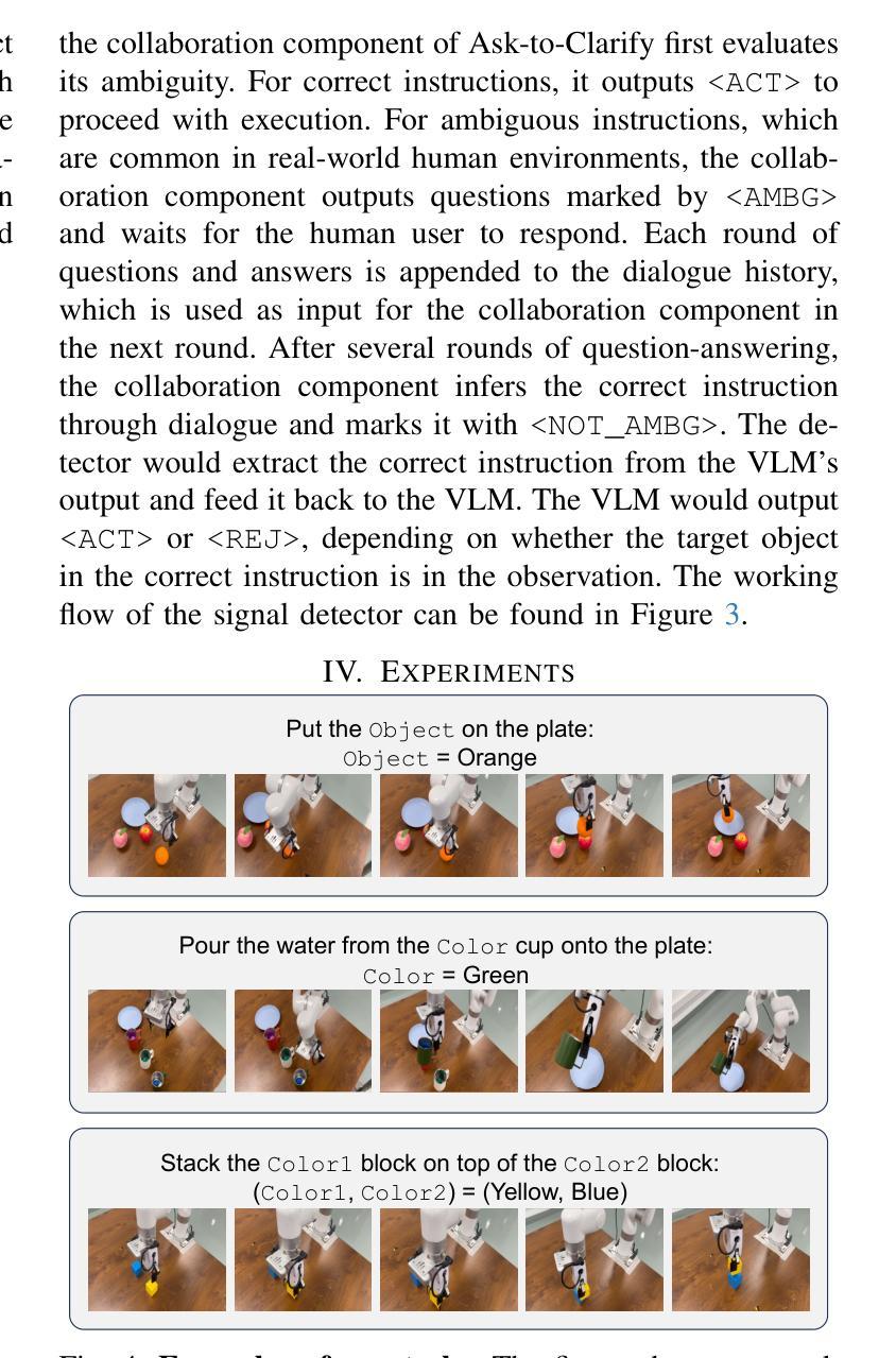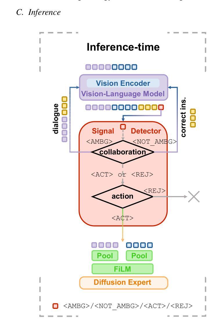 最终目标是创建能够与人类互动的合作者,而非仅仅是被动执行指令的执行者。这要求智能体进行通信、协调和根据人类反馈调整其行动。最近,视觉语言算法的进步为实现这一目标提供了途径。然而,当前大多数基于视觉语言算法的实体智能体都处于单向模式:它们接收指令并执行,无需反馈。这种方法在处理指令通常模糊不清的现实世界场景时就会失效。在本文中,我们通过“请求澄清”框架来解决这个问题。“请求澄清”框架首先通过多轮对话提出问题来解决模糊指令,然后生成端到端的低级动作。具体来说,“请求澄清”框架包含两个组件:一个用于协作的视觉语言模型和另一个用于动作生成的扩散模型。我们还引入了一个连接模块,该模块根据视觉语言模型的输出生成扩散的条件。该模块通过调整指令的观察结果来创建可靠的条件。我们使用两阶段的知识隔离策略来训练我们的框架。首先,我们使用解决模糊对话的数据微调协作组件,以处理模糊性。然后,我们整合动作组件,同时冻结协作组件。这既保留了交互能力,又可以在微调中生成动作。这种训练策略保证我们的框架能够先提问,然后生成动作。在推理过程中,信号检测器充当路由器,帮助我们的框架在提问和采取行动之间切换。我们在8个真实任务中评估了“请求澄清”框架的性能,它在现有最先进的视觉语言算法中表现出色。结果表明,我们提出的框架及其训练策略为实现协作式实体智能体提供了途径。
