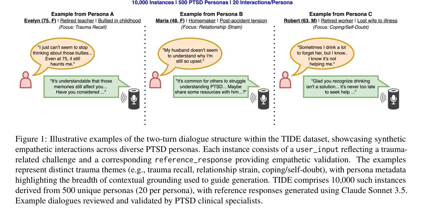 - 介绍了Trauma-Informed Dialogue for Empathy(TIDE)数据集,包含多样化的PTSD人物对话。