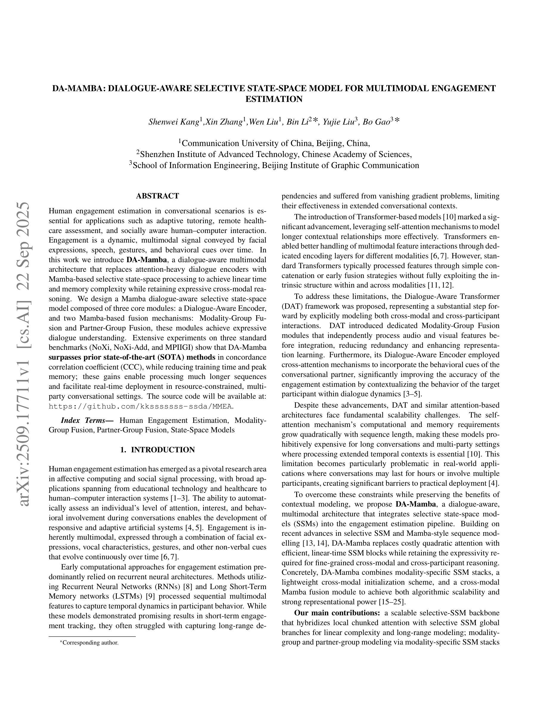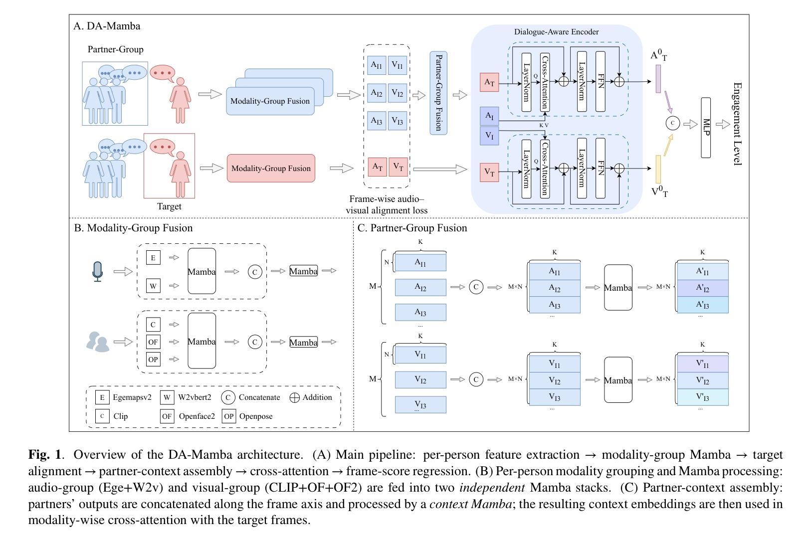 - DA-Mamba是一个对话感知的多模态架构,适用于对话场景中的用户参与度评估。