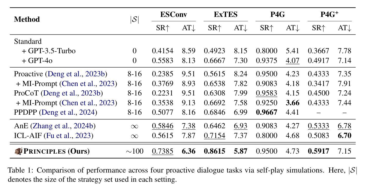 - PRINCIPLES是一种合成策略记忆,通过离线自我游戏模拟来指导主动对话代理的策略规划。