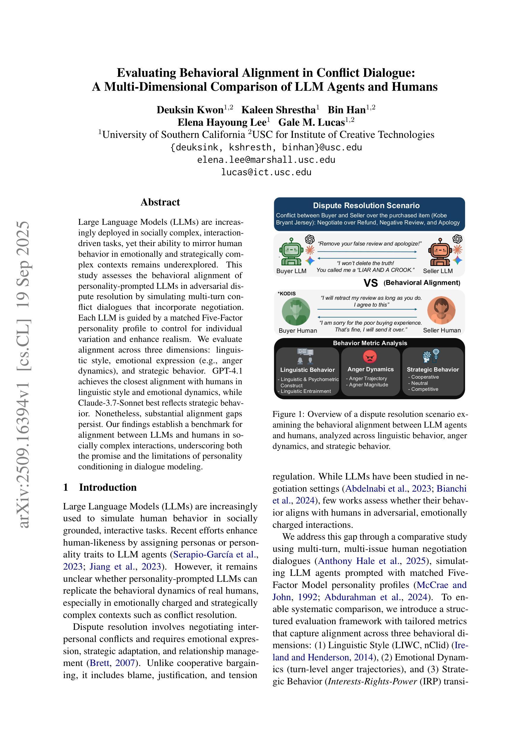 - 本研究通过模拟多轮冲突对话评估了人格引导的LLMs在争议解决中的行为一致性。