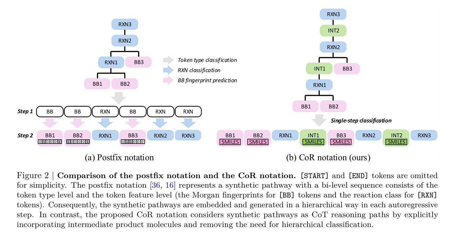 - 借鉴大型语言模型的推理路径概念,ReaSyn提出了反应链(CoR)标记法,以利用合成路径中的化学知识。