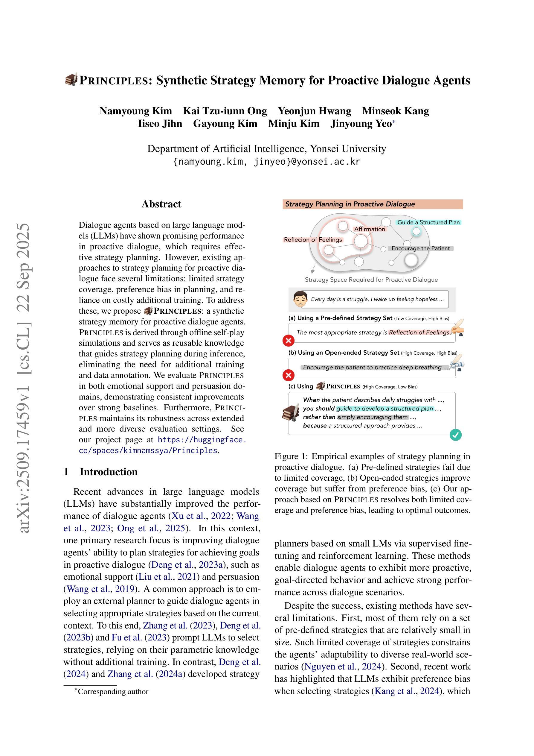 基于大型语言模型(LLM)的对话代理人在主动性对话中表现出有前景的性能,这需要进行有效的策略规划。然而,现有的主动性对话策略规划方法面临一些局限性:策略覆盖面有限、规划中的偏好偏见以及依赖昂贵的额外训练。为了解决这些问题,我们提出了PRINCIPLES:一种用于主动性对话代理人的合成策略记忆。PRINCIPLES是通过离线自我游戏模拟得出的,作为一种可重复使用的知识,在推理过程中指导策略规划,无需额外的训练和数据标注。我们在情感支持和劝说领域对PRINCIPLES进行了评估,与强大的基线相比,表现出了持续的一致性改进。此外,PRINCIPLES在扩展和更多样化的评估环境中也保持了其稳健性。请访问我们的项目页面https://huggingface.co/spaces/kimnamssya/Principles了解详情。