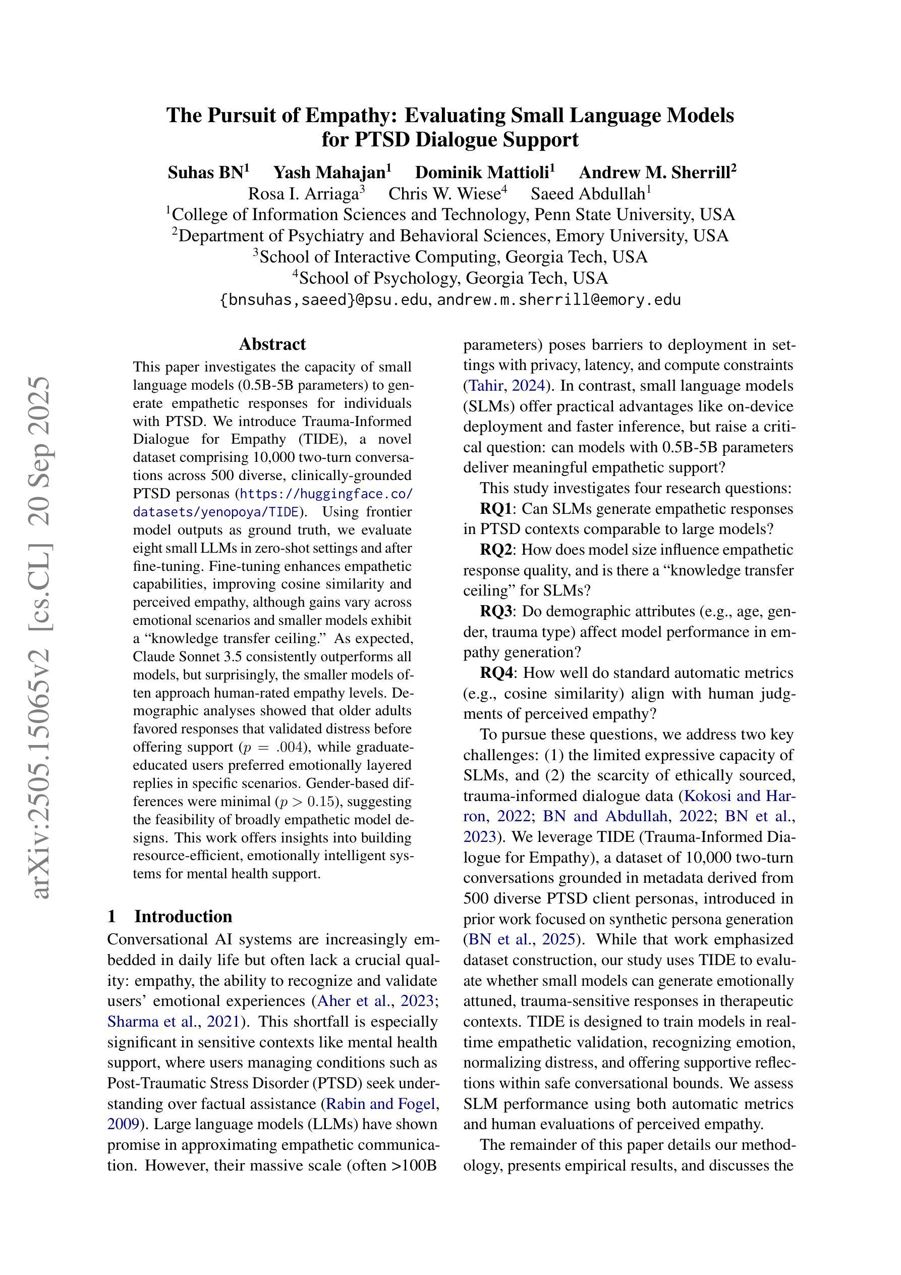本文探讨了小型语言模型(参数范围在0.5B到5B之间)在生成针对患有PTSD个体的同理心回应方面的能力。文章介绍了一种名为Trauma-Informed Dialogue for Empathy(TIDE)的新型数据集,其中包含1万组针对500个不同且基于临床的PTSD人物的二轮对话。文章对八种小型LLM进行了零样本评估和微调后的评估,发现微调可以提高模型的同理心能力,但在不同情感场景下效果各异,小型模型存在“知识转移上限”。Claude Sonnet 3.5表现最佳,但令人惊讶的是,小型模型往往也能达到人类水平的同理心。人口统计分析显示,成年人更喜欢在提供支持前先验证痛苦(p = .004),而高学历用户在特定场景下的情感回复更丰富。性别差异较小(p > 0.15),表明广泛设计具有同理心的模型是可行的。本文为构建资源高效、情感智能的心理健康支持系统提供了见解。