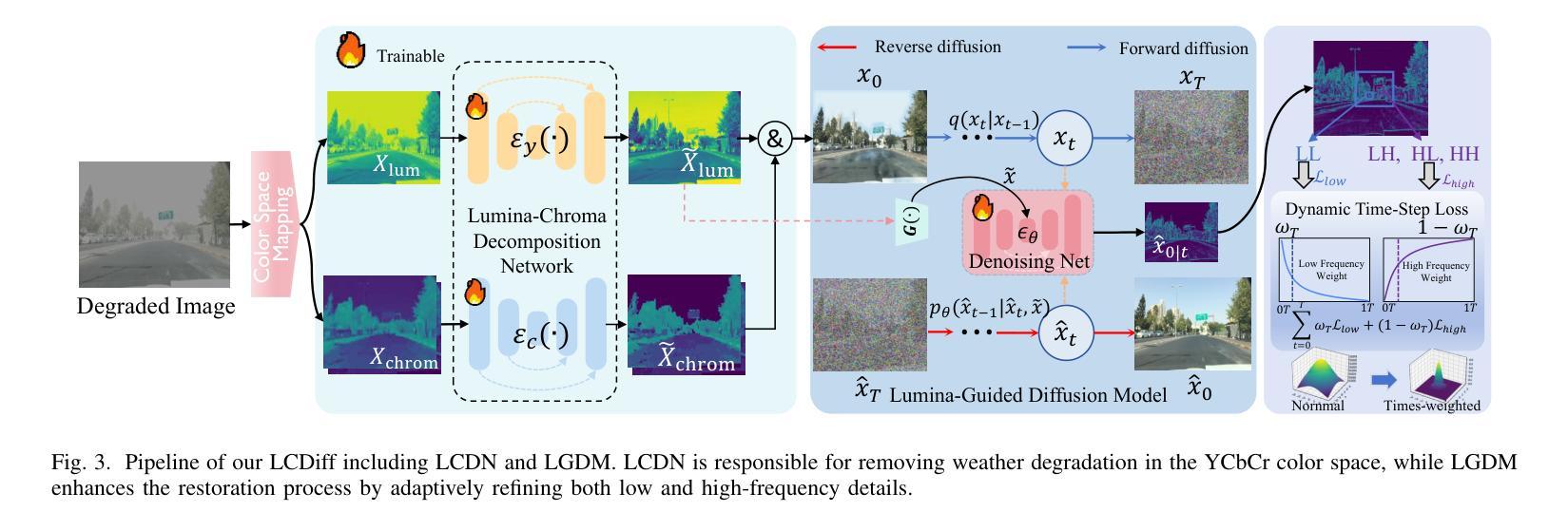 恶劣天气图像恢复(AWIR)是一项极具挑战性的任务,因为天气相关的退化是不可预测和动态的。传统的针对特定任务的方法往往不能推广到未见过的或复杂的退化类型,而最近的提示学习的方法严重依赖于视觉语言模型的退化估计能力,导致恢复结果不一致。在本文中,我们提出了一个新的框架LCDiff,它包含两个关键组件:亮度-色度分解网络(LCDN)和亮度引导扩散模型(LGDM)。LCDN在YCbCr颜色空间处理退化图像,分别处理与退化相关的亮度和退化不变的色度组件。这种分解有效地减轻了天气引起的退化,同时保持颜色保真度。为了进一步改善恢复质量,LGDM利用与退化相关的亮度信息作为指导条件,消除了对明确退化提示的需求。此外,LGDM还采用了一种动态时间步长损失来优化去噪网络,确保图像中低频和高频特征的平衡恢复。最后,我们推出了DriveWeather,这是一个全面的全天候驾驶数据集,旨在实现稳健的评估。大量实验表明,我们的方法超越了最先进的方法,在AWIR中树立了新的基准。数据集和代码可在:https://github.com/fiwy0527/LCDiff获取。