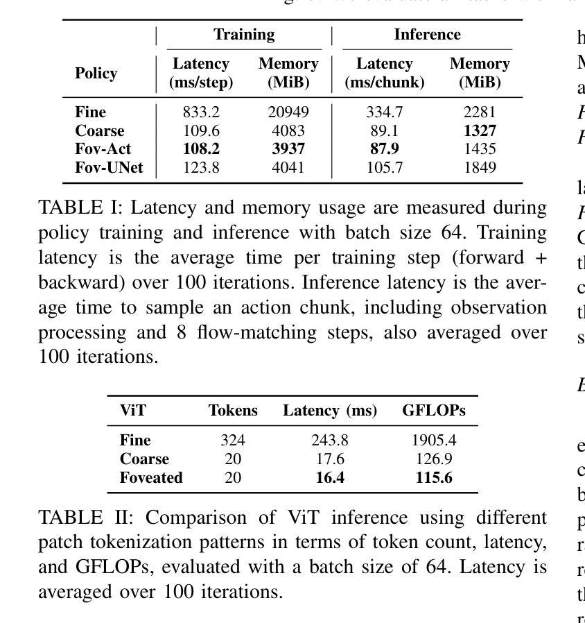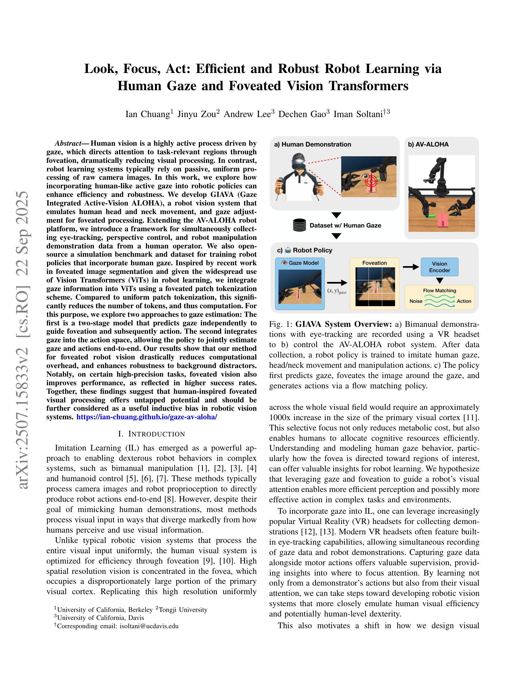 人类的视觉是一个由注视驱动的高度活跃的过程,通过注视将注意力集中在与任务相关的区域,从而极大地减少视觉处理。相比之下,机器人学习系统通常依赖于对原始相机图像的被动均匀处理。在这项工作中,我们探讨了将人类类似的主动注视融入机器人策略如何增强效率和稳健性。我们开发了GIAVA(集成注视的主动视觉ALOHA),这是一个模拟人类头部和颈部运动以及注视调整进行焦点处理的机器人视觉系统。在AV-ALOHA机器人平台的基础上,我们引入了一个框架,可以同时从人类操作者那里收集眼动追踪、视角控制和机器人操作演示数据。我们还开源了一个模拟基准测试和数据集,用于训练融入人类注视的机器人策略。受最近关于焦点图像分割工作的启发,以及Vision Transformers(ViTs)在机器人学习中的广泛应用,我们通过一种焦点补丁标记方案将注视信息融入ViTs。与均匀的补丁标记相比,这显著减少了标记的数量,从而减少了计算量。我们的结果表明,我们的焦点机器人视觉方法极大地减少了计算开销,并增强了对抗背景干扰项的稳健性。值得注意的是,在某些高精度任务上,焦点视觉也提高了性能,体现在更高的成功率上。总体而言,这些发现表明人类启发的焦点视觉处理具有巨大的潜力,并应进一步考虑将其作为机器人视觉系统中的一个有用的归纳偏见。https://ian-chuang.github.io/gaze-av-aloha/