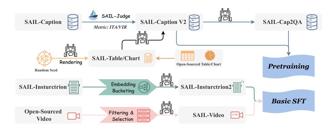 - SAIL-VL2通过大规模数据整理管道提高了数据质量和分布,改进了标注、OCR、QA和视频数据的训练效率。