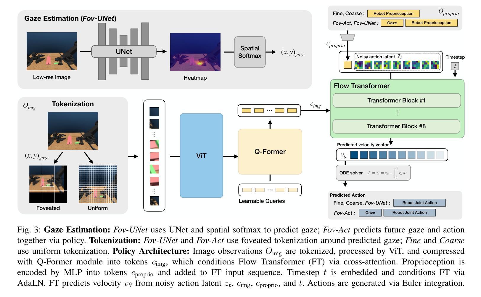 本研究探索了将人类式的主动视线融入机器人策略,以提高机器人视觉系统的效率和稳健性。研究团队开发了GIAVA(视线集成主动视觉ALOHA),一个模仿人类头部和颈部运动以及视线调整的机器人视觉系统。该研究将视线信息融入Vision Transformers(ViTs),采用注视补丁标记方案,相较于传统的均匀补丁标记,显著减少了标记数量,降低了计算量。研究结果表明,注视机器人视觉方法大幅降低了计算开销,提高了对背景干扰因素的稳健性,并在某些高精度任务上提升了性能。