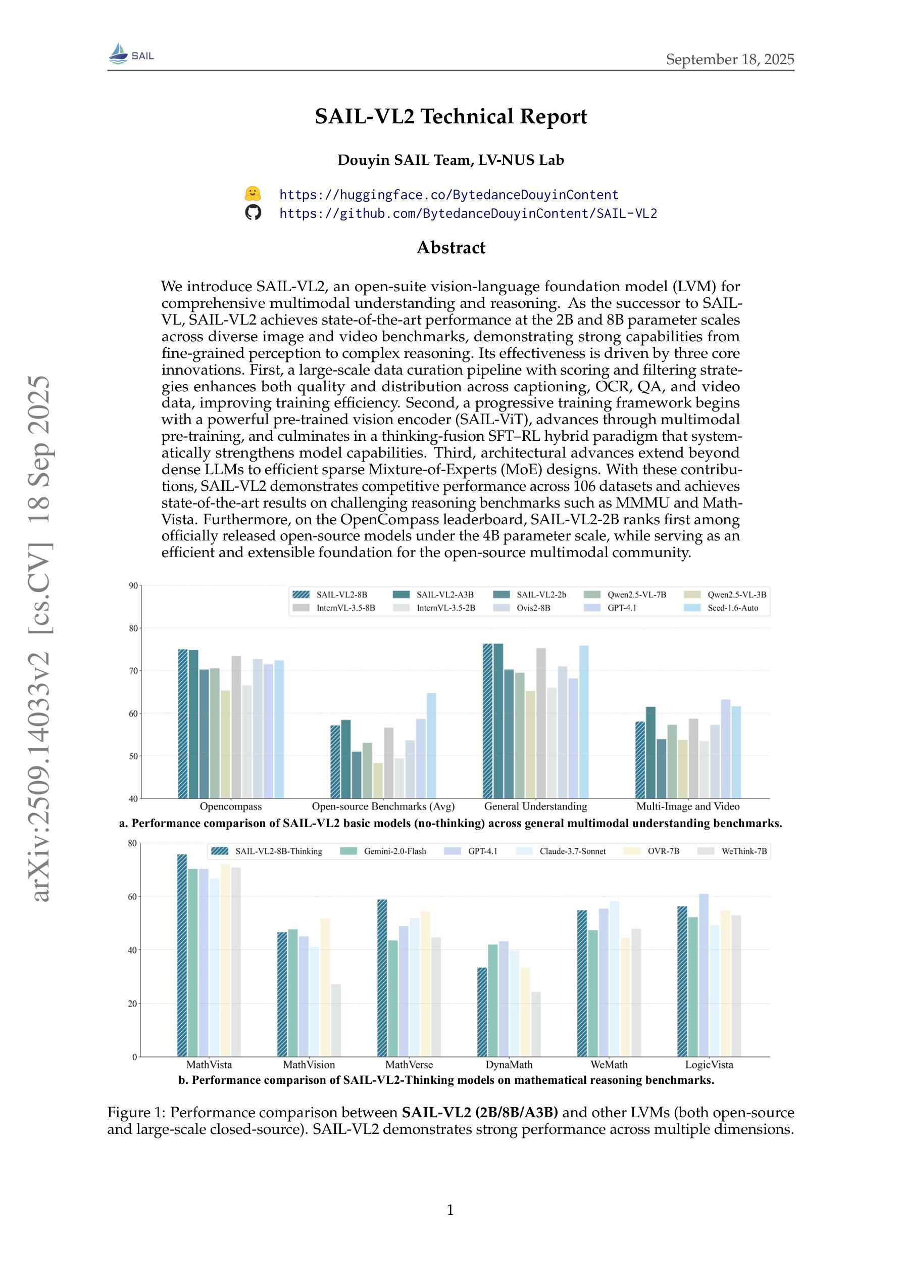 我们介绍了SAIL-VL2,这是一个开放的视觉语言基础模型(LVM),用于全面的多模式理解和推理。作为SAIL-VL的后续产品,SAIL-VL2在不同参数规模的2B和8B上实现了最先进的性能,在多种图像和视频基准测试中展示了从精细粒度感知到复杂推理的强大能力。它的有效性源于三个核心创新。首先,采用大规模数据整理管道,结合评分和过滤策略,提高了描述、OCR、问答和视频数据的质量和分布,提高了训练效率。其次,渐进式训练框架从一个强大的预训练视觉编码器(SAIL-ViT)开始,通过多模式预训练,最终形成一个系统强化模型能力的思维融合SFT-RL混合范式。第三,架构上的进步超越了密集的大型语言模型,采用了高效的稀疏专家混合(MoE)设计。通过这些贡献,SAIL-VL2在106个数据集上展现了竞争力,并在具有挑战性的推理基准测试(如MMMU和MathVista)上取得了最先进的成果。此外,在OpenCompass排行榜上,SAIL-VL2-2B在官方发布的开源模型中位列4B参数规模的第一名,成为开源多模式社区高效且可扩展的基础。