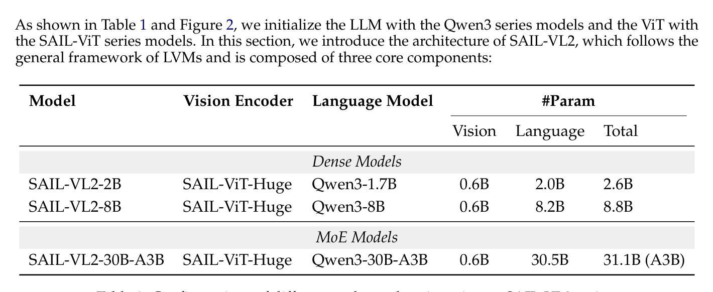 - SAIL-VL2的架构进步超越了密集的LLMs,采用了高效的稀疏Mixture-of-Experts(MoE)设计。