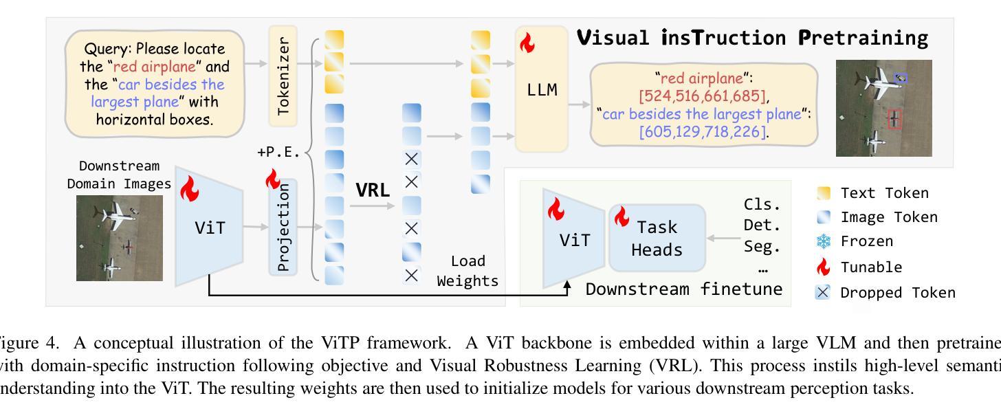 视觉Transformer在下游领域预训练模型的新范式。提出ViTP(视觉指令预训练)方法,直接利用推理增强感知能力。通过ViT(视觉Transformer)骨干网嵌入视觉语言模型,并利用从目标下游领域收集的大量视觉指令数据进行端到端的预训练。通过VRL(视觉稳健学习)促使ViT从稀疏的视觉令牌集中学习稳健且与领域相关的特征。在远程感应和医学影像等领域的基准测试中表现优异。代码已上传至GitHub。
