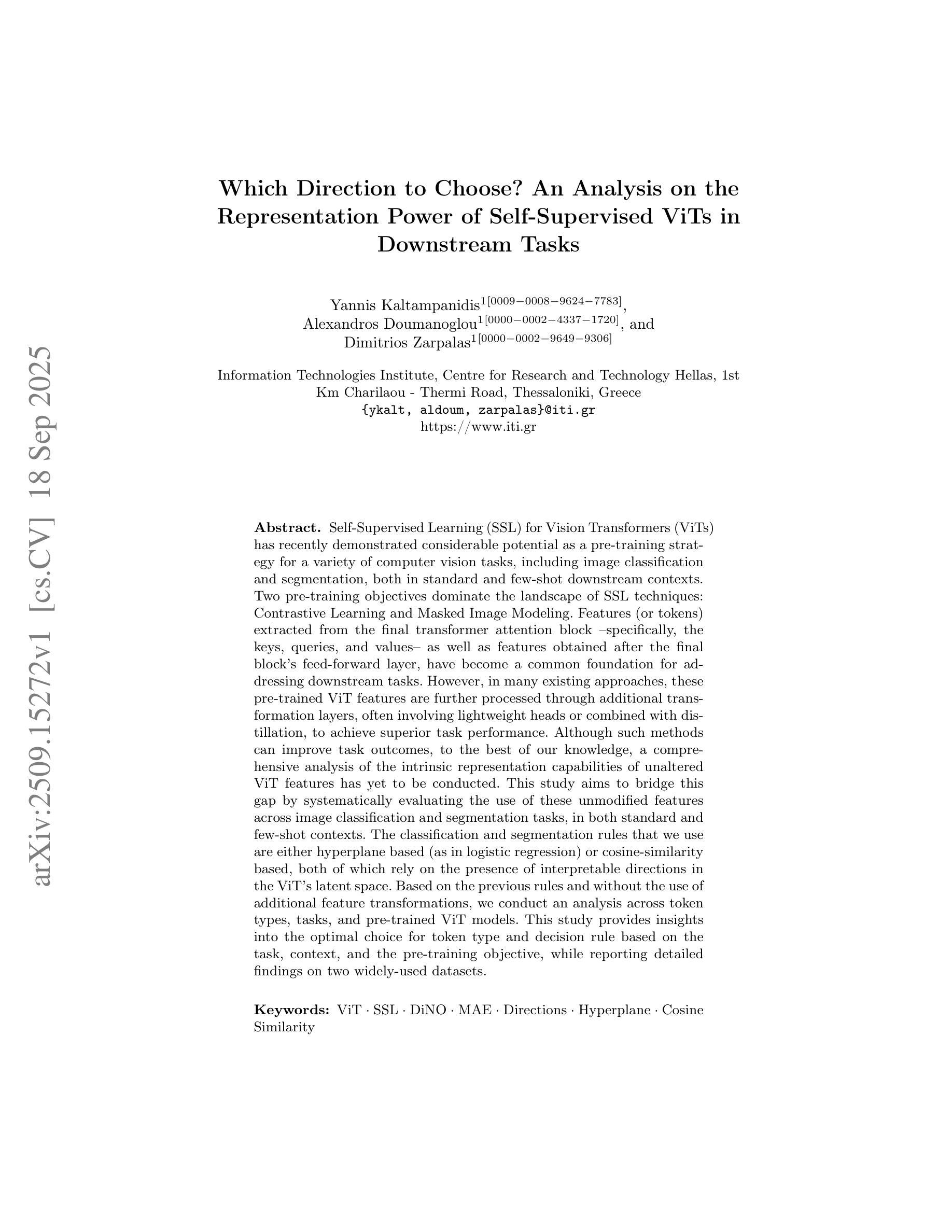 自监督学习(SSL)对于视觉转换器(ViTs)已经显示出巨大的潜力,作为一种预训练策略,它可以应用于各种计算机视觉任务,包括标准和少样本下游环境中的图像分类和分割。在SSL技术中,两种预训练目标占据主导地位:对比学习和掩模图像建模。从最终的转换器注意力块中提取的特征(或令牌),特别是键、查询和值,以及从最后一个块的前馈层之后获得的特征,已经成为解决下游任务的常见基础。然而,在许多现有方法中,这些预训练的ViT特征会经过额外的转换层进行处理,通常涉及轻量级头部或与蒸馏相结合,以实现卓越的任务性能。尽管这些方法可以改善任务结果,但据我们所知,尚未对未经修改的ViT特征的内在表示能力进行全面分析。本研究旨在通过系统地评估这些未修改的特征在图像分类和分割任务中的应用来弥补这一空白,无论是在标准还是在少样本环境中皆是如此。我们使用的分类和分割规则是基于超平面的(如逻辑回归),或是基于余弦相似性的,两者都依赖于ViT潜在空间中可解释方向的存在。基于之前的规则和没有使用额外的特征转换,我们对令牌类型、任务和预训练的ViT模型进行了分析。本研究为基于任务、上下文和预训练目标的令牌类型和决策规则的最佳选择提供了见解,并在两个广泛使用的数据集上报告了详细的发现。