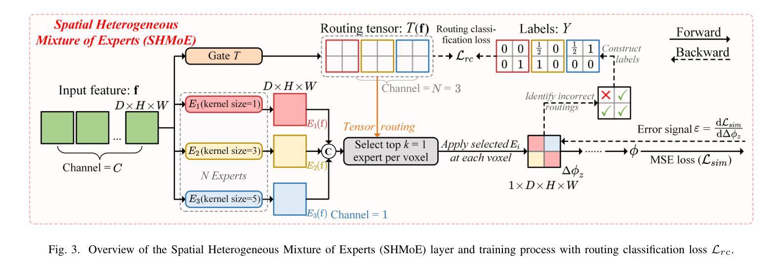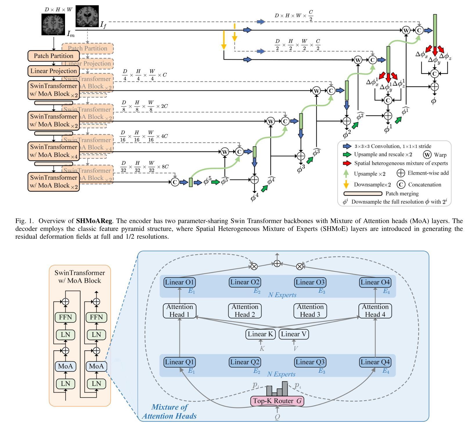 本文提出一种基于深度学习的新型专家引导可变形图像配准网络(SHMoAReg),在编码器和解码器中应用了混合专家(MoE)机制。该网络通过引入混合注意力头(MoA)增强特征提取的专业性,并通过空间异质混合专家(SHMoE)实现各方向上的异质性变形预测。实验结果显示,该网络在公开数据集上的表现优于其他方法,特别是在腹部CT数据集上Dice得分提高了从60.58%到65.58%。同时,SHMoAReg还提高了模型的解释性。本文首次将MoE机制引入DIR任务。