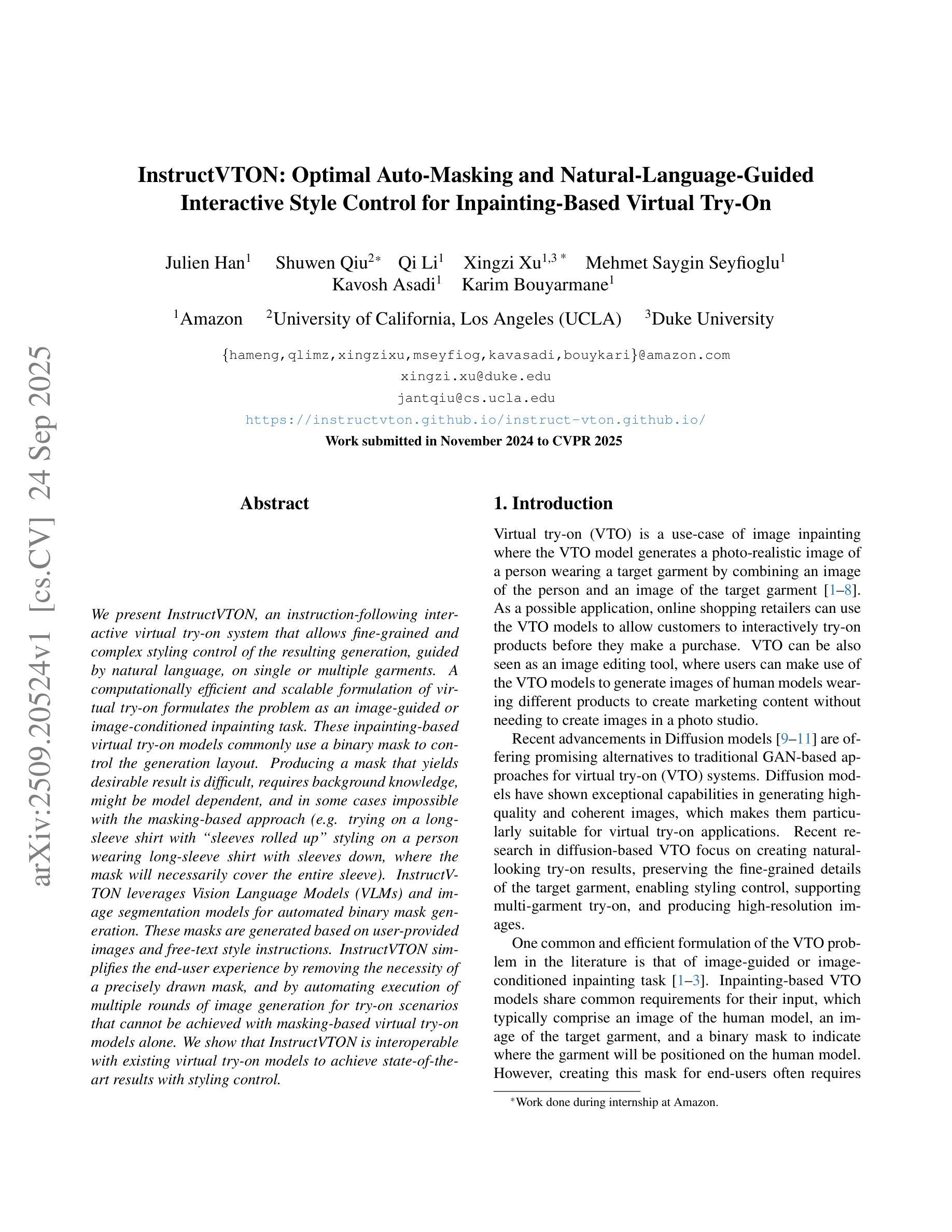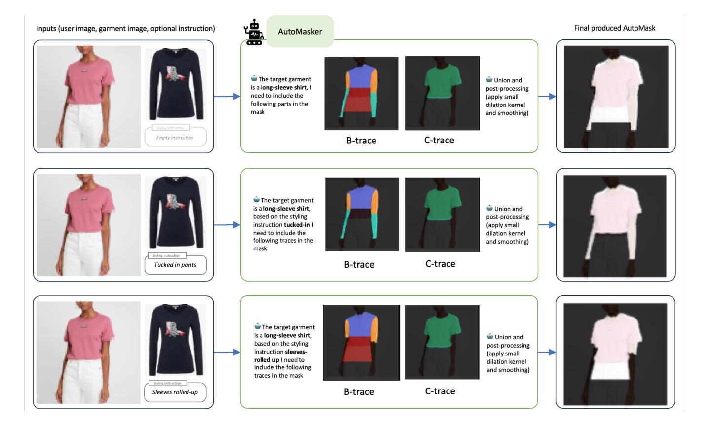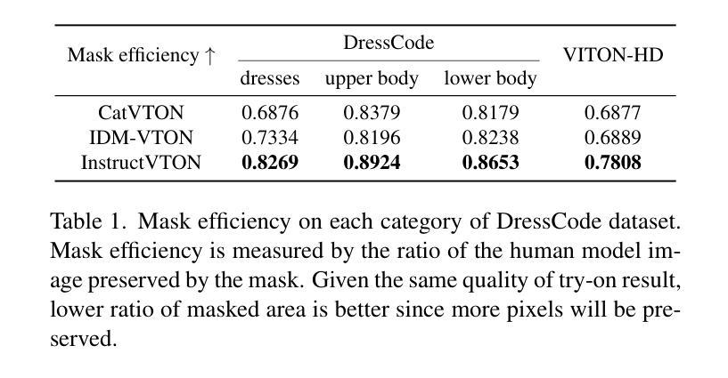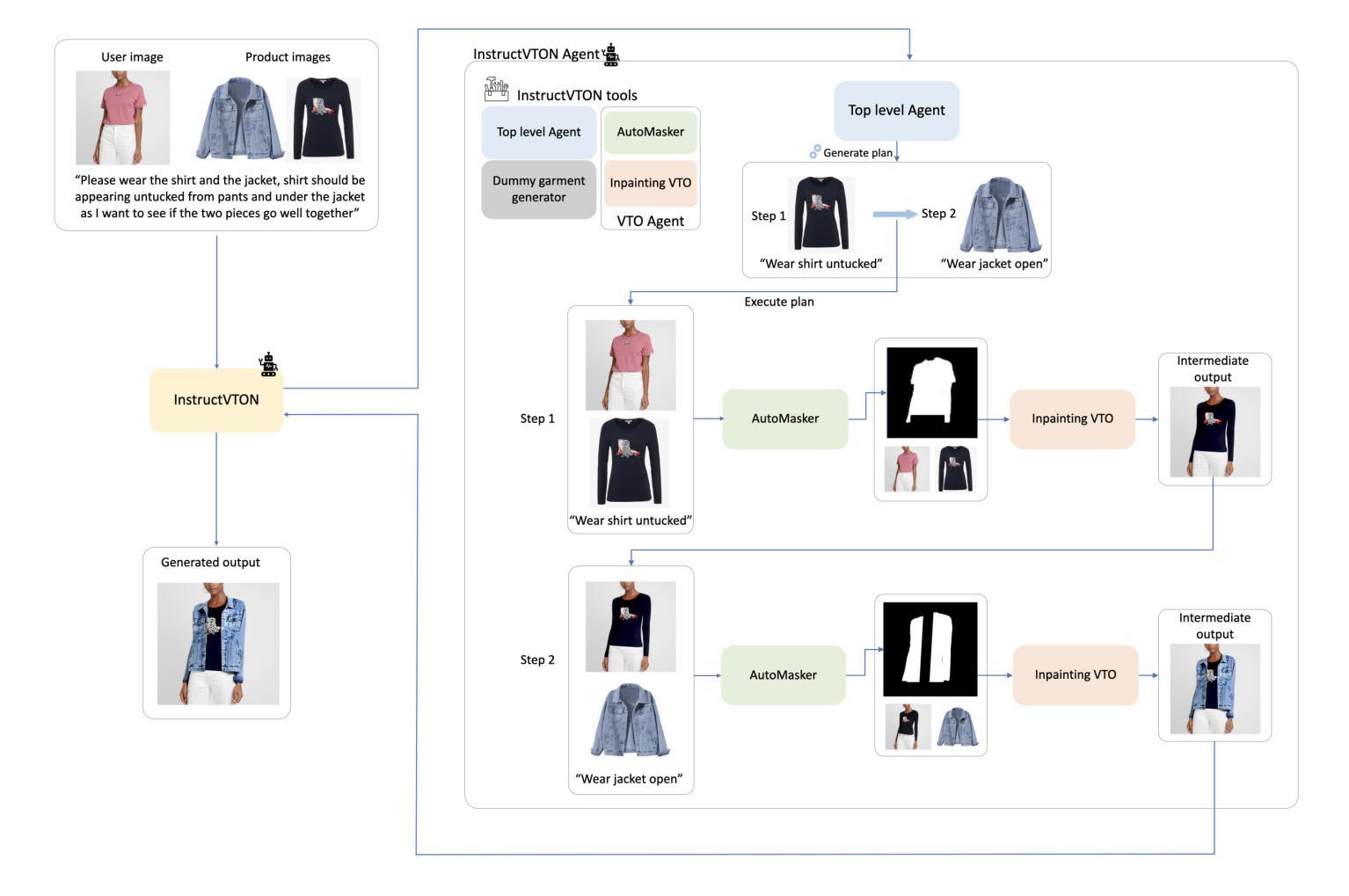 我们介绍了InstructVTON,这是一个遵循指令的交互式虚拟试穿系统,允许通过自然语言指导对单一或多个服装进行精细粒度和复杂的样式控制,从而生成结果。虚拟试穿的计算高效和可扩展的公式将其表述为图像引导或图像条件的修复任务。这些基于修复技术的虚拟试穿模型通常使用二进制蒙版来控制生成布局。产生理想的蒙版是困难的,需要背景知识,可能是模型依赖的,并且在某些情况下使用基于蒙版的方法是不可能的(例如在穿着放下袖子长袖衬衫的人身上试穿“袖子卷起”的长袖衬衫,蒙版必然会覆盖整个袖子)。InstructVTON利用视觉语言模型(VLM)和图像分割模型进行自动二进制蒙版生成。这些蒙版是根据用户提供的图像和自由文本样式指令生成的。InstructVTON简化了最终用户的使用体验,通过去除精确绘制蒙版的必要性,并自动化执行多轮图像生成,以实现仅使用基于蒙版的虚拟试穿模型无法实现的试穿场景。我们证明了InstructVTON可以与现有的虚拟试穿模型协同工作,以实现具有样式控制的最新结果。