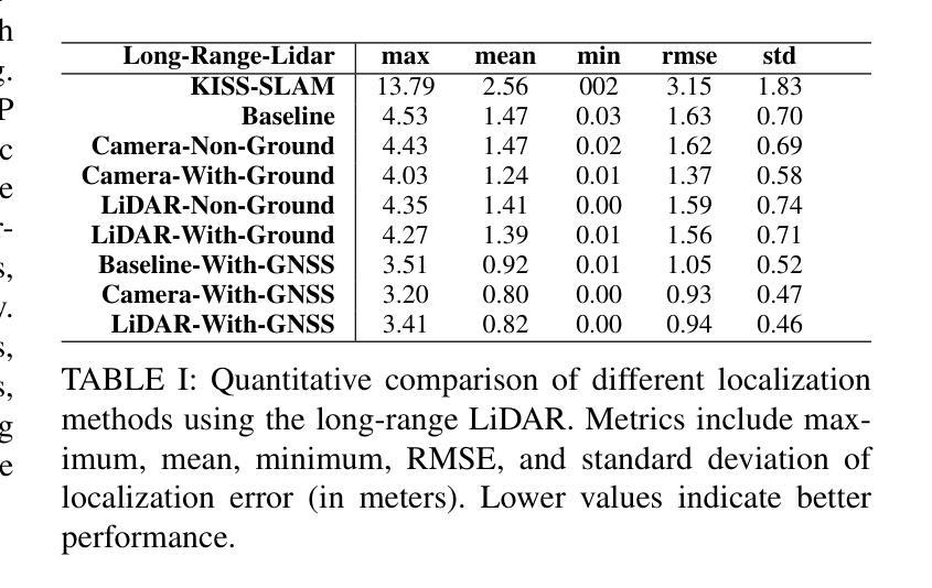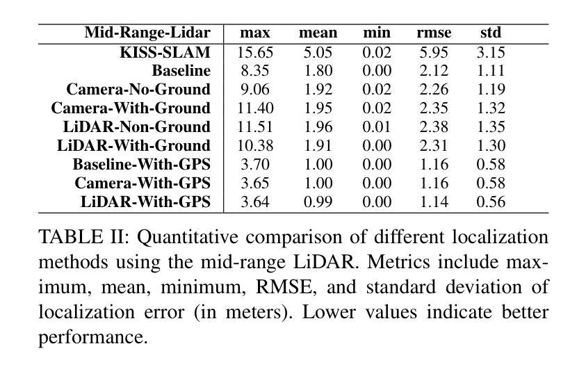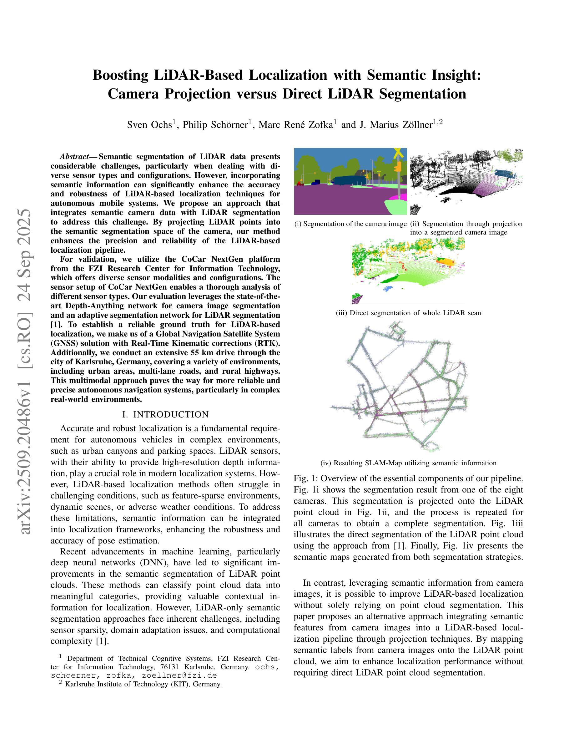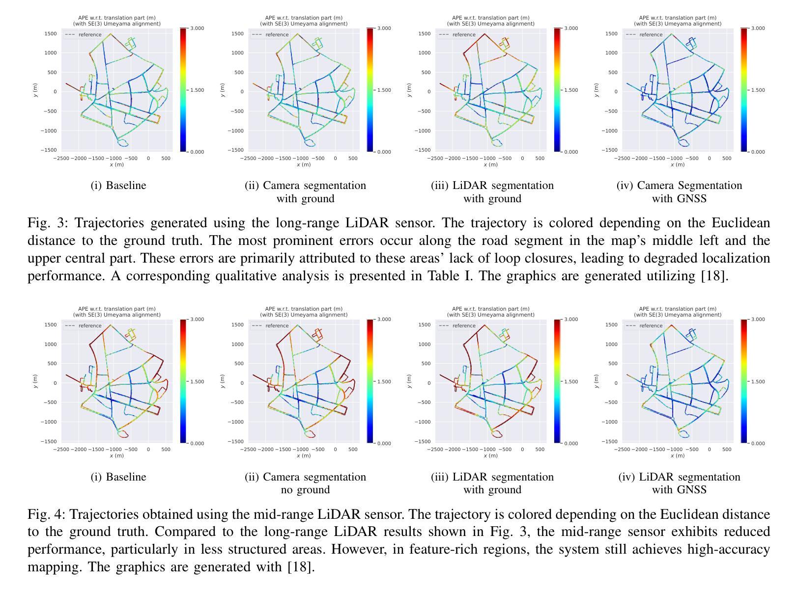 为了验证,我们使用了FZI信息技术研究中心的CoCar NextGen平台,该平台提供了多种传感器模式和配置。CoCar NextGen的传感器设置能够对不同的传感器类型进行彻底分析。我们的评估利用最先进的用于相机图像分割的Depth-Anything网络,以及用于激光雷达分割的自适应分割网络。为了建立可靠的基于激光雷达的定位的地面真实情况,我们采用了具有实时动态校正的全球导航卫星系统(GNSS)解决方案。此外,我们在德国卡尔斯鲁厄市进行了长达55公里的驾驶测试,涵盖了多种环境,包括城区、多车道公路和乡村高速公路。这种多模式方法为更可靠和精确的自主导航系统铺平了道路,特别是在复杂的现实环境中。